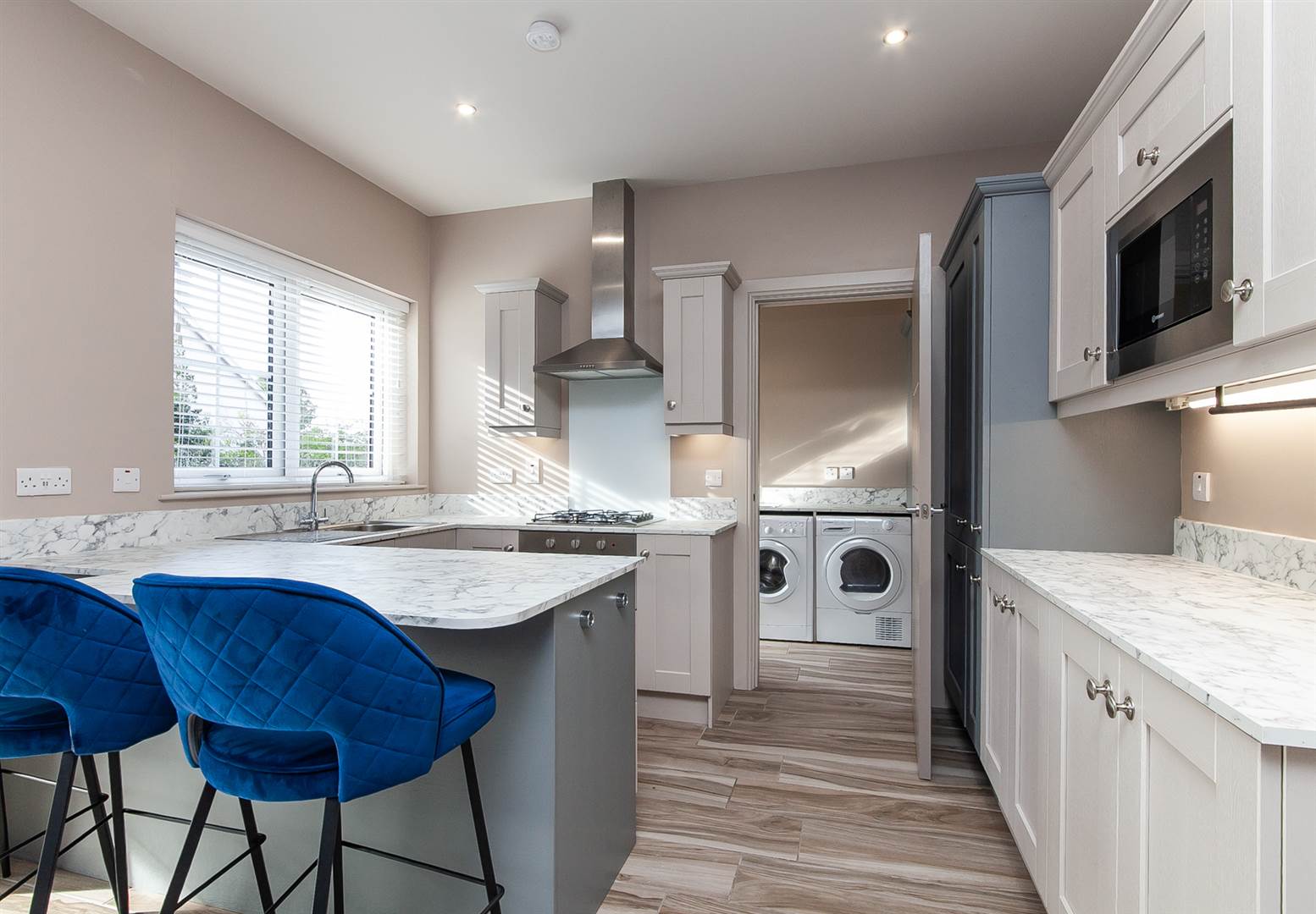 Range of low level cupboards in a shaker style, marble effect worktops and splashback, single drainer stainless steel sink with mixer tap, broom cupboard, plumed for washing machine and space for tumble dryer, wood effect tiled floor. Double glazed door to terrace.