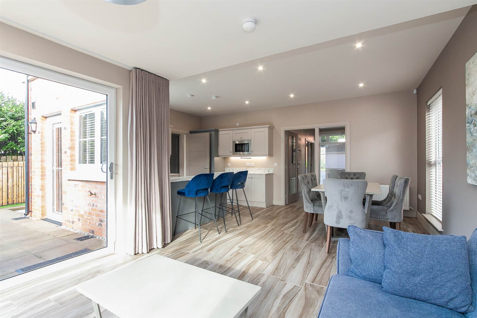 Luxury kitchen with a range of high and low level cupboards in a shaker style, under unit lighting, marble effect worktops, breakfast bar area, single drainer stainless steel sink and mixer tap, four ring gas hob, glass splashback, stainless steel extractor above, under oven, integrated dishwasher, fridge freezer and microwave, wood effect tiled floor throughout. Living area has views over the garden, sliding patio doors to raised south facing terrace, glazed door and side light to entrance hall.