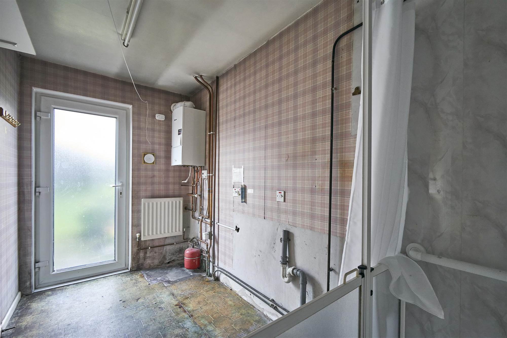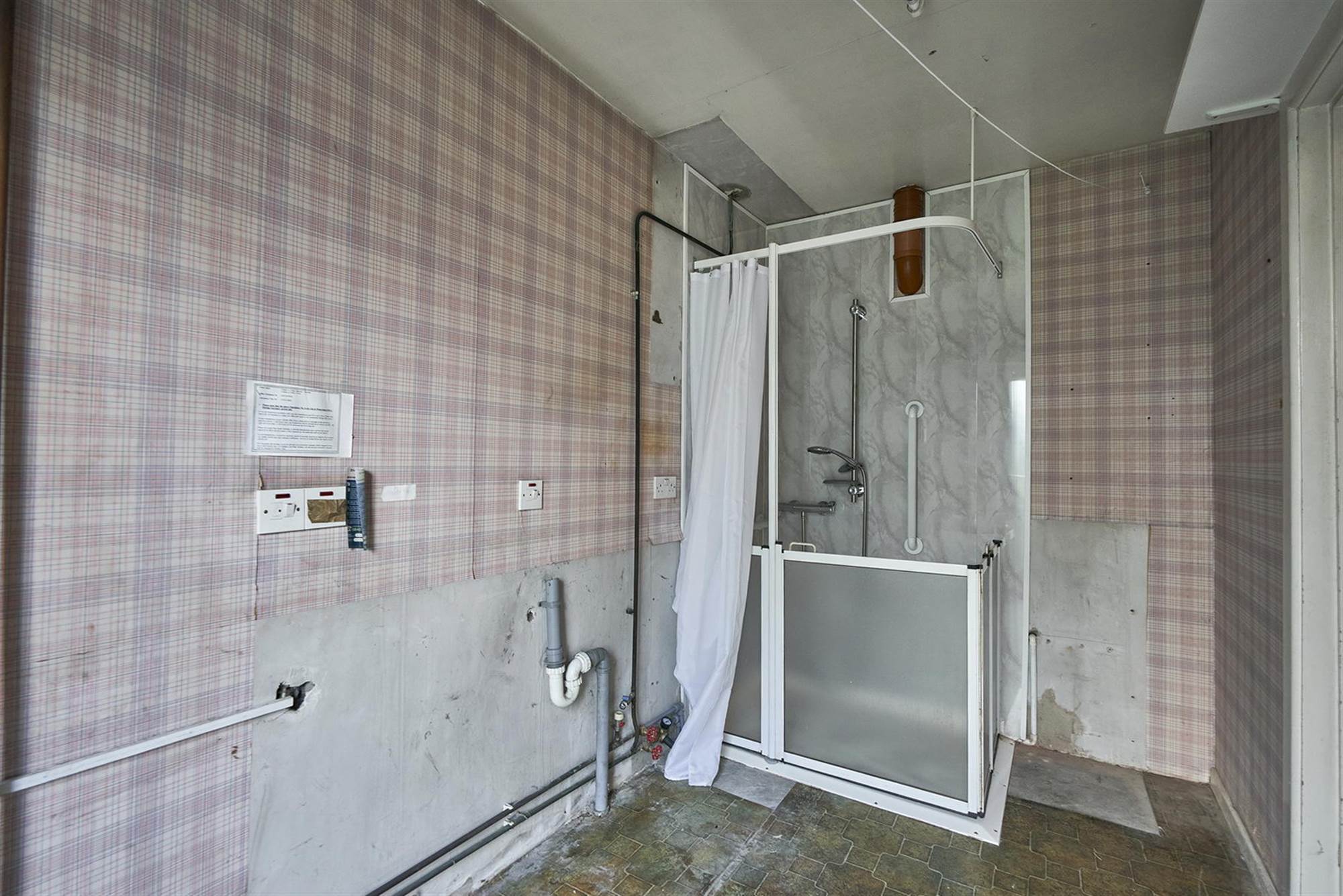 Plumbed for washing machine, built in shower cubicle with mains shower, Worcester gas fired boiler. UPVC double glazed door to exterior.