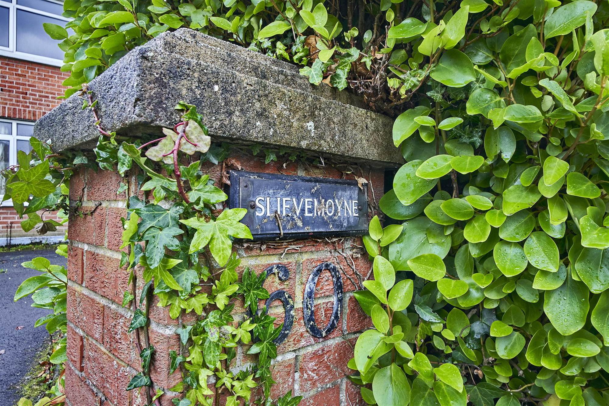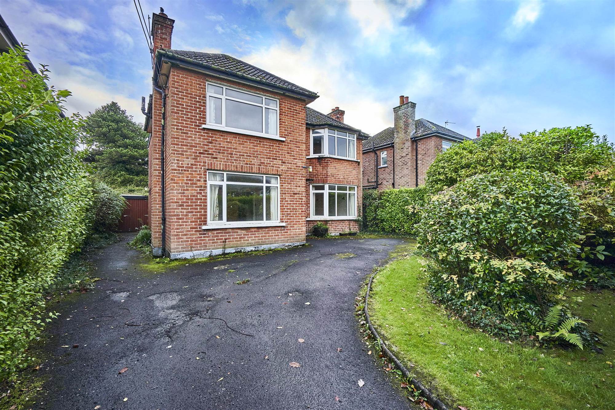 Front garden in lawn bordered by trees and shrubs