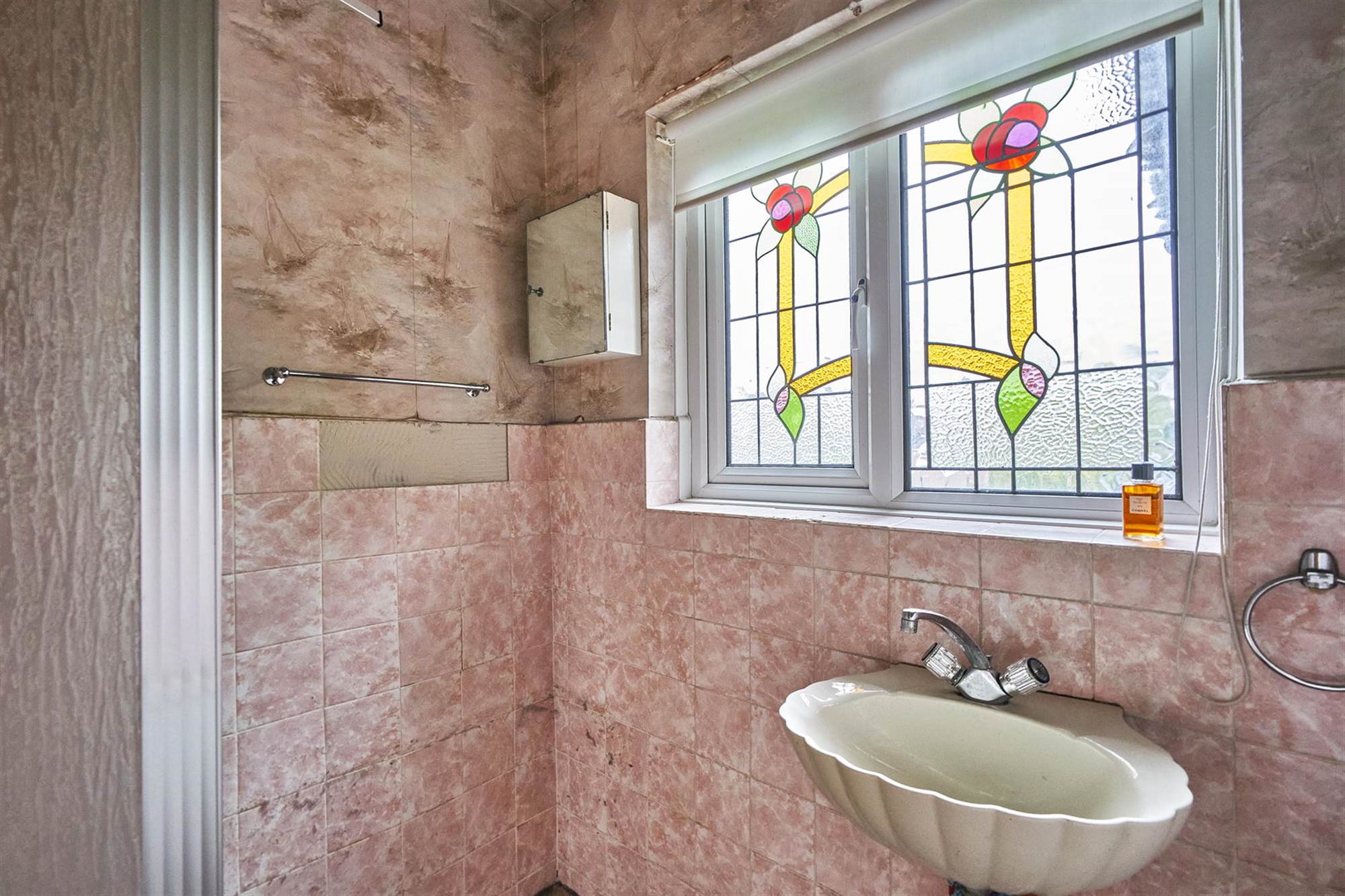 Feature built in shower cubicle with Redring electric shower unit, wash hand basin, part tiled walls, leaded stained glass double glazed window.