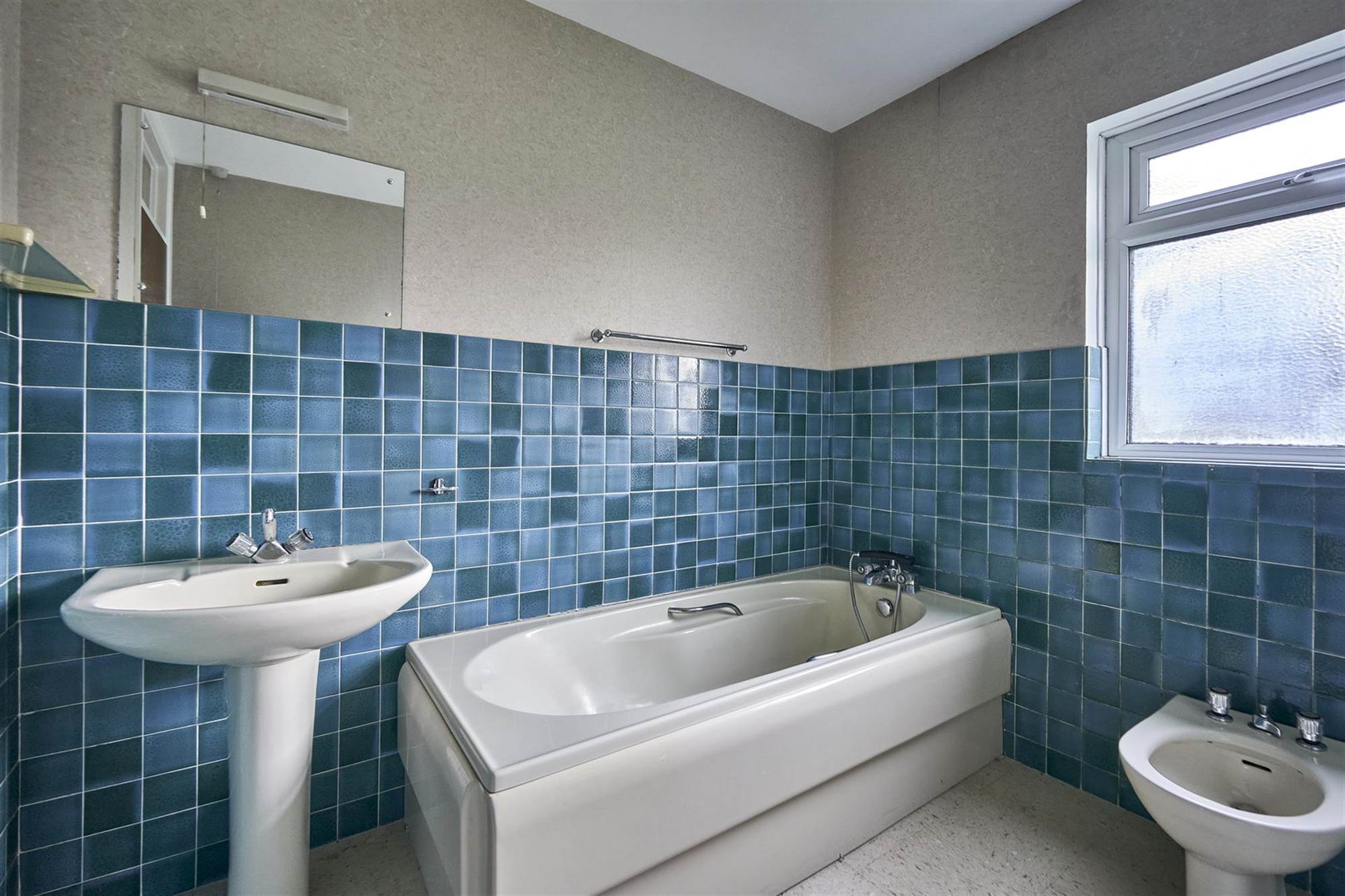 Cream bathroom suite, comprising panelled bath, pedestal wash hand basin, low flush wc, bidet, half tiled walls.