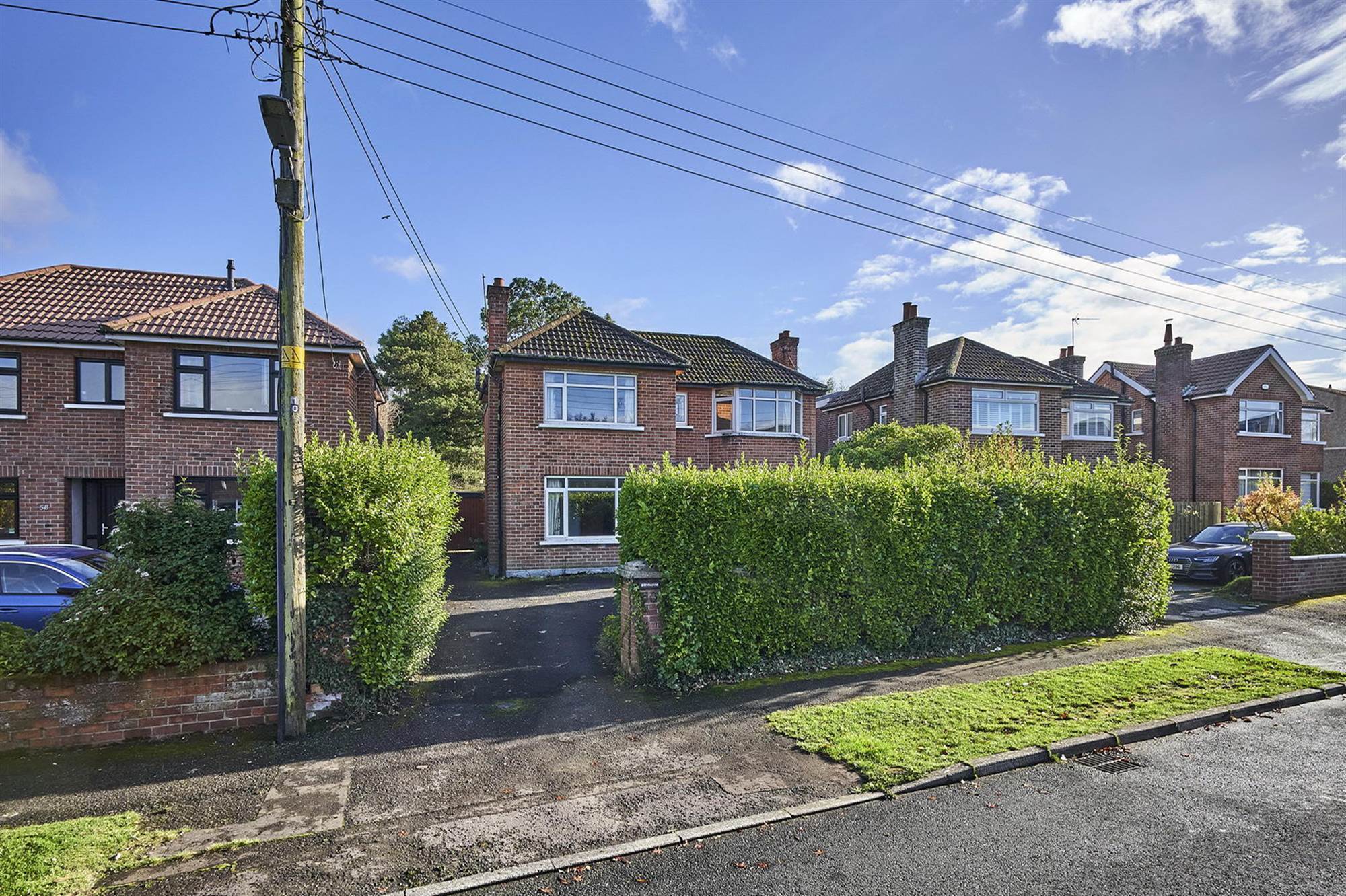 Tarmac driveway offering ample driveway. Front garden in lawn wit mature shrubs, bordered by hedging.