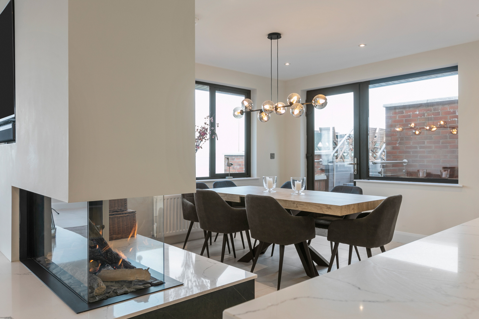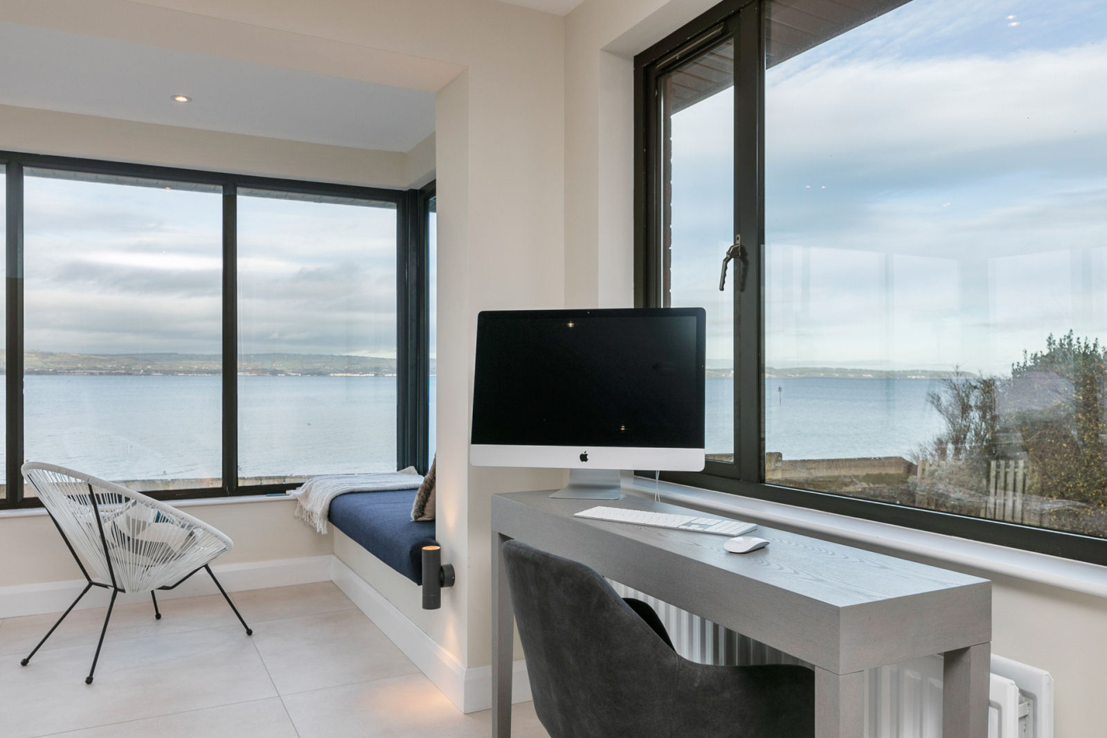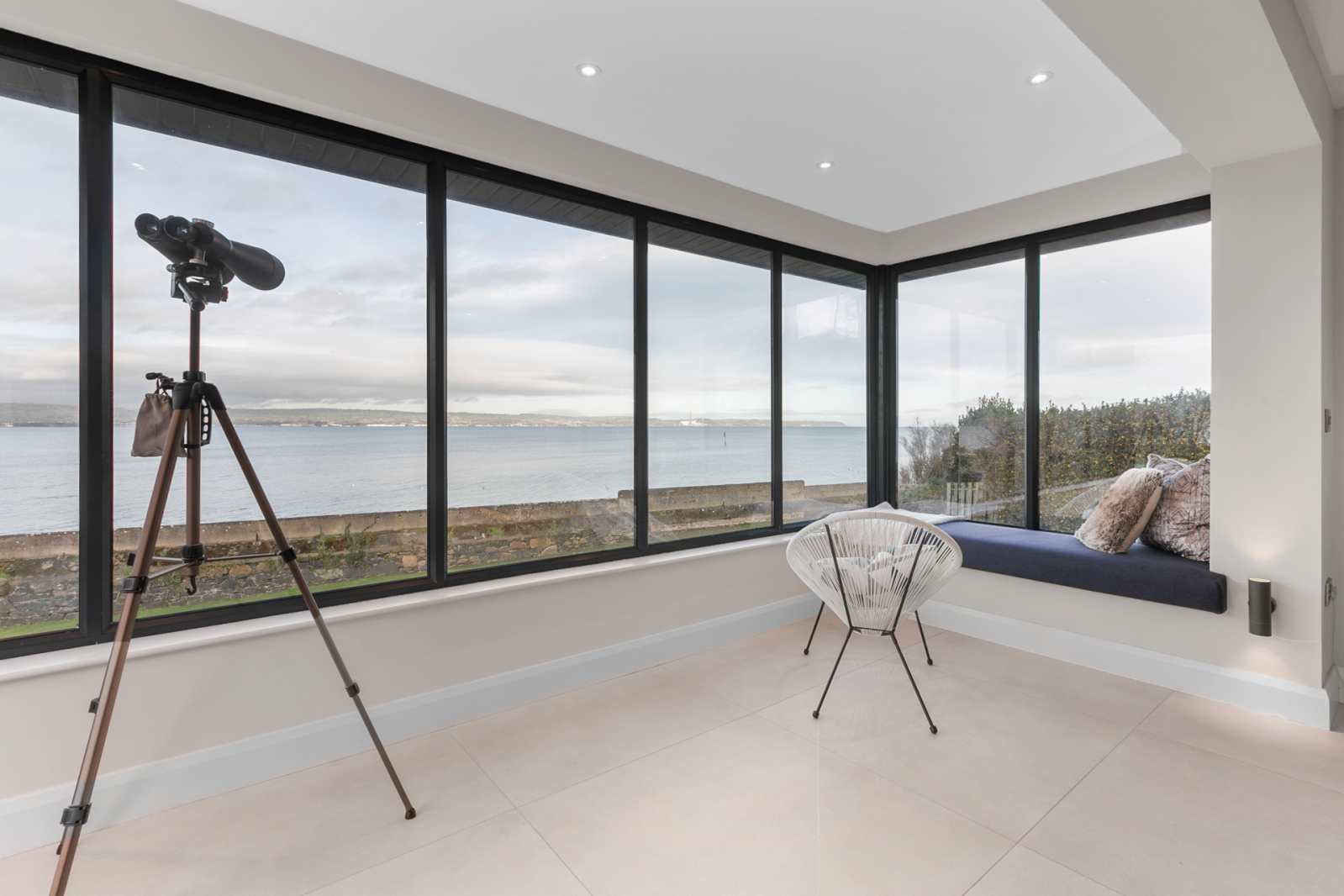 Contemporary double sided gas fire to kitchen and dining, sliding doors to balcony, window seating, panoramic sea views, low voltage spot lights, tiled floor.