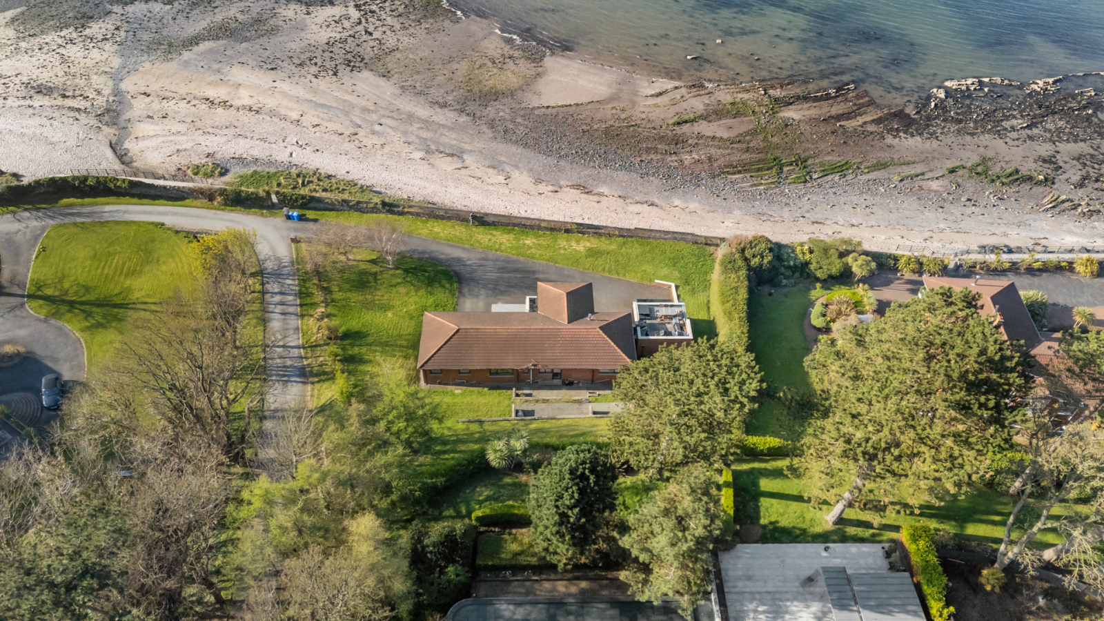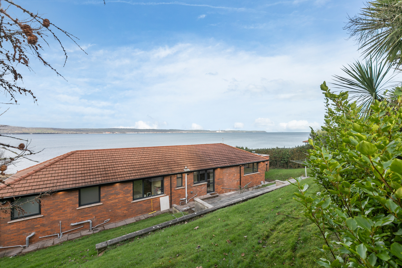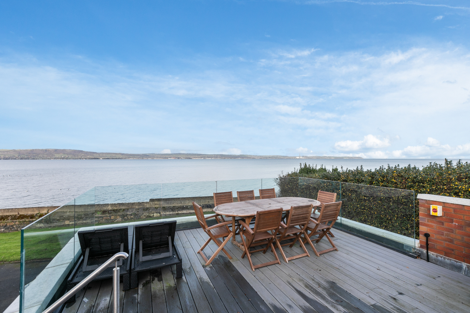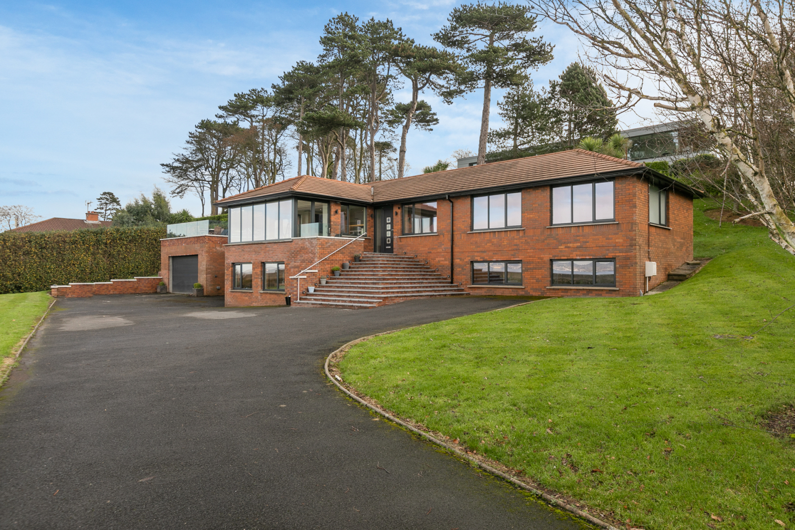 Set over two levels, the accommodation has been tastefully modernised to a high specification. The entrance hall leads to an impressive open-plan living, dining and kitchen area with uninterrupted views across Belfast Lough and access to generous front and side terraces - ideal for entertaining. The space is stylishly divided by a feature three-sided gas fire, while the bespoke kitchen includes high-end integrated appliances, extensive cabinetry and a large island with casual dining. A separate utility room provides access to the rear.