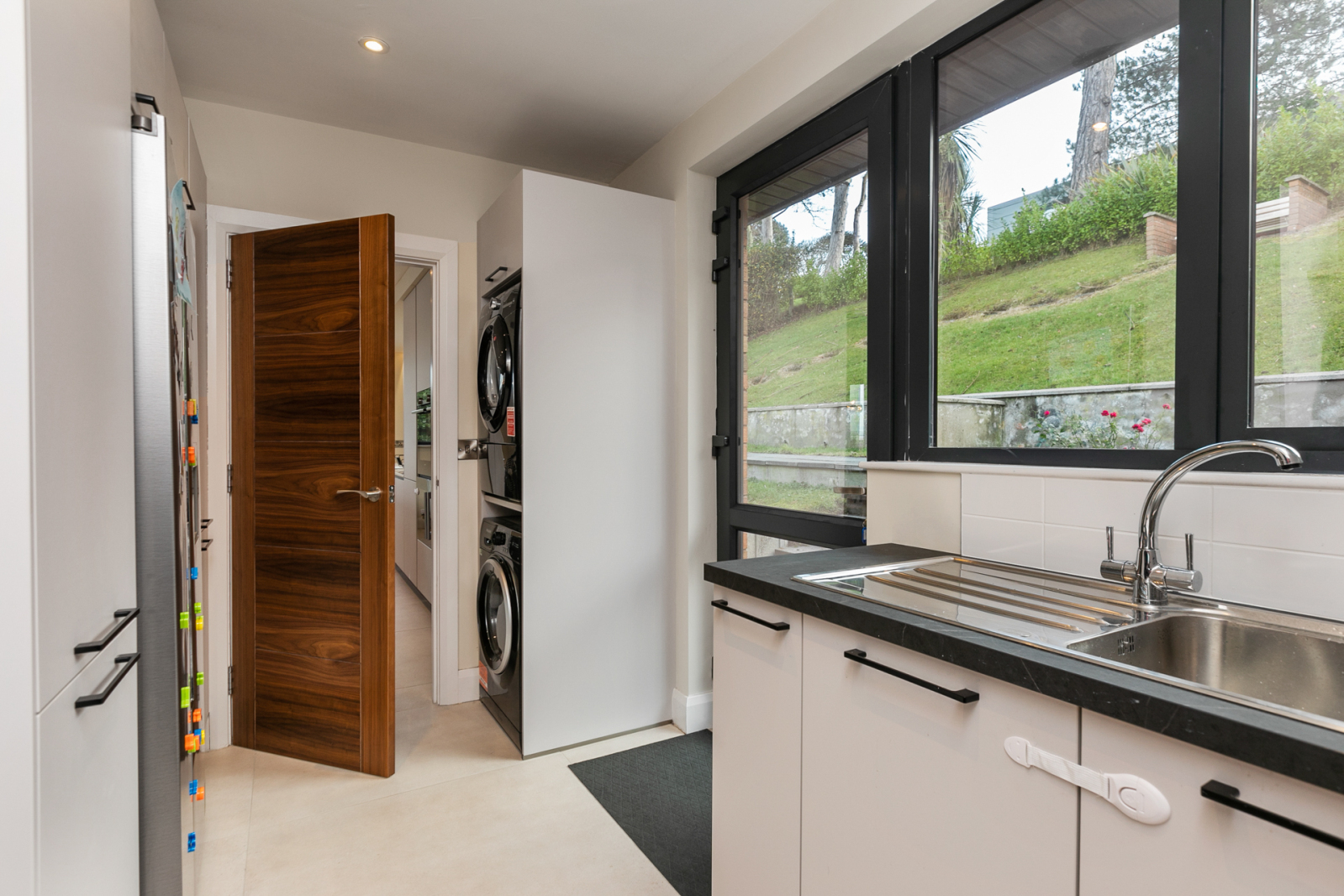 High and low level units, stainless steel single drainer sink unit with mixer taps, washing machine, tumble dryer, American fridge freezer, gas boiler, door to rear.