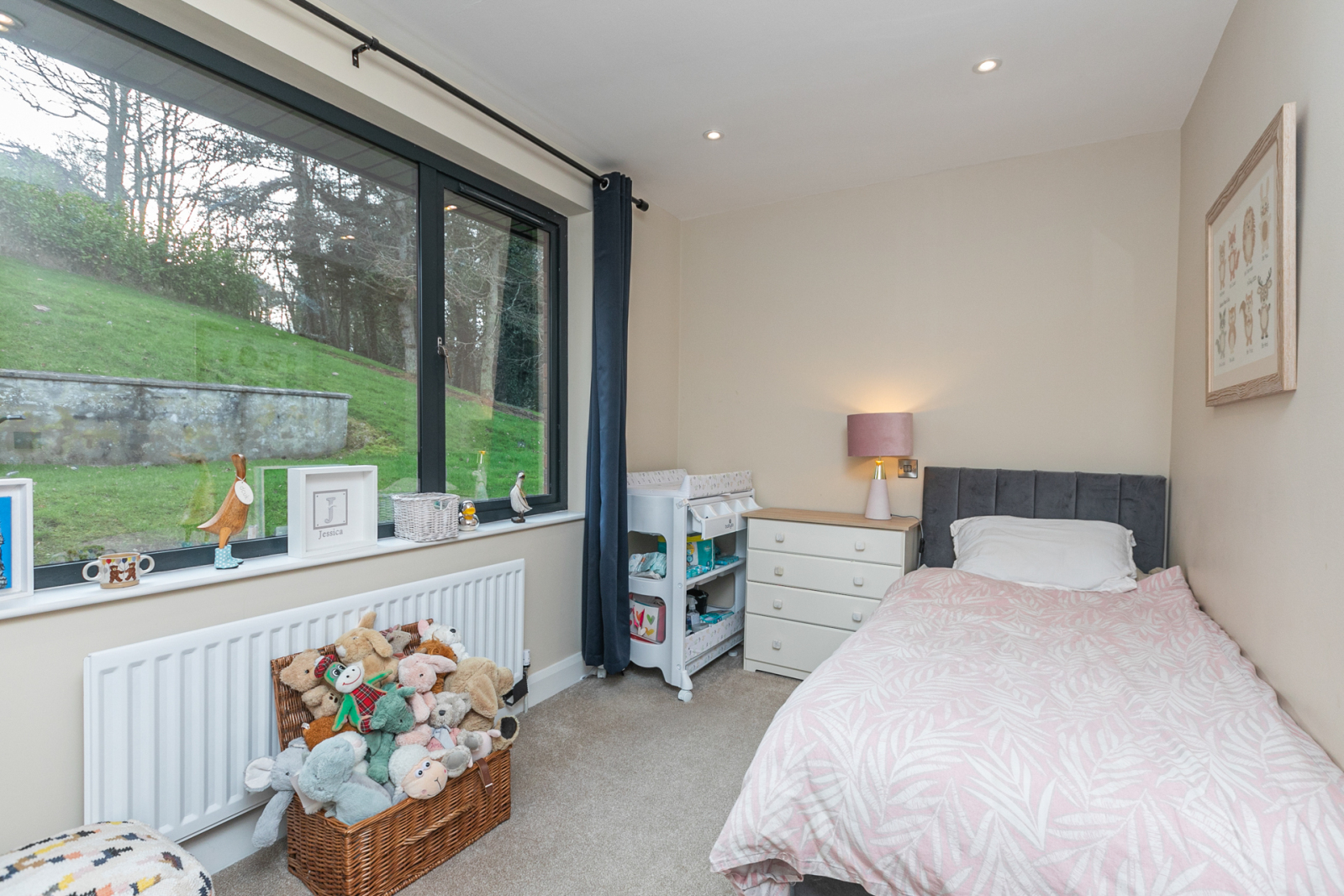Outlook to private rear garden. Low voltage spot lights.