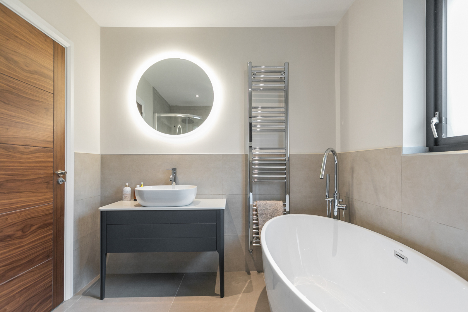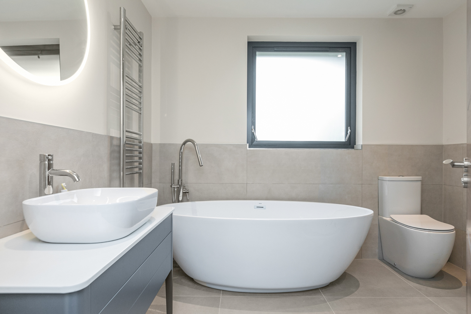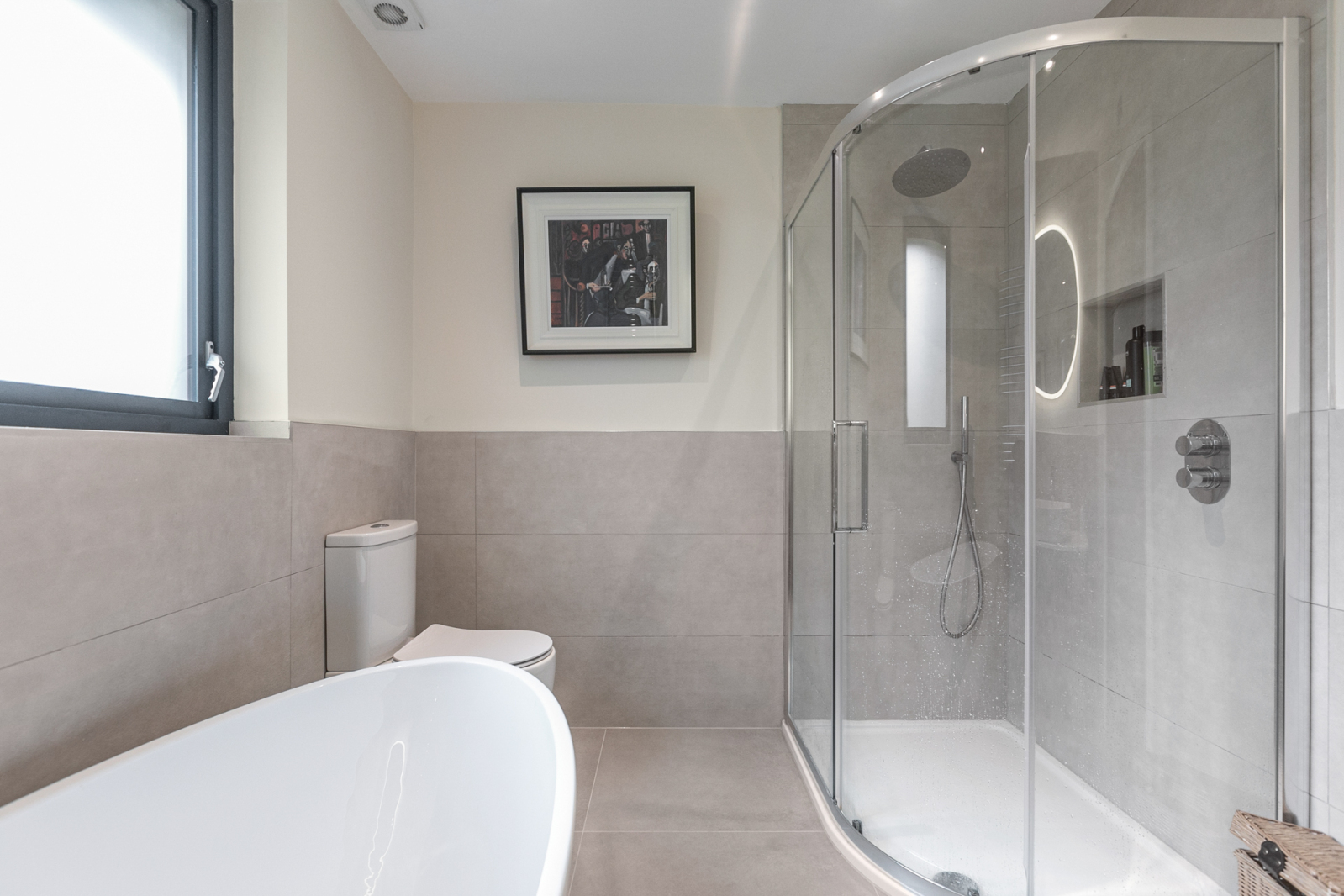 Contemporary suite comprising of low flush WC, freestanding bath with feature chrome mixer tap, wash hand basin with vanity storage, large walk in shower with chrome thermostatic shower unit. Chrome heated towel rail, tiled floor, part tiled walls.