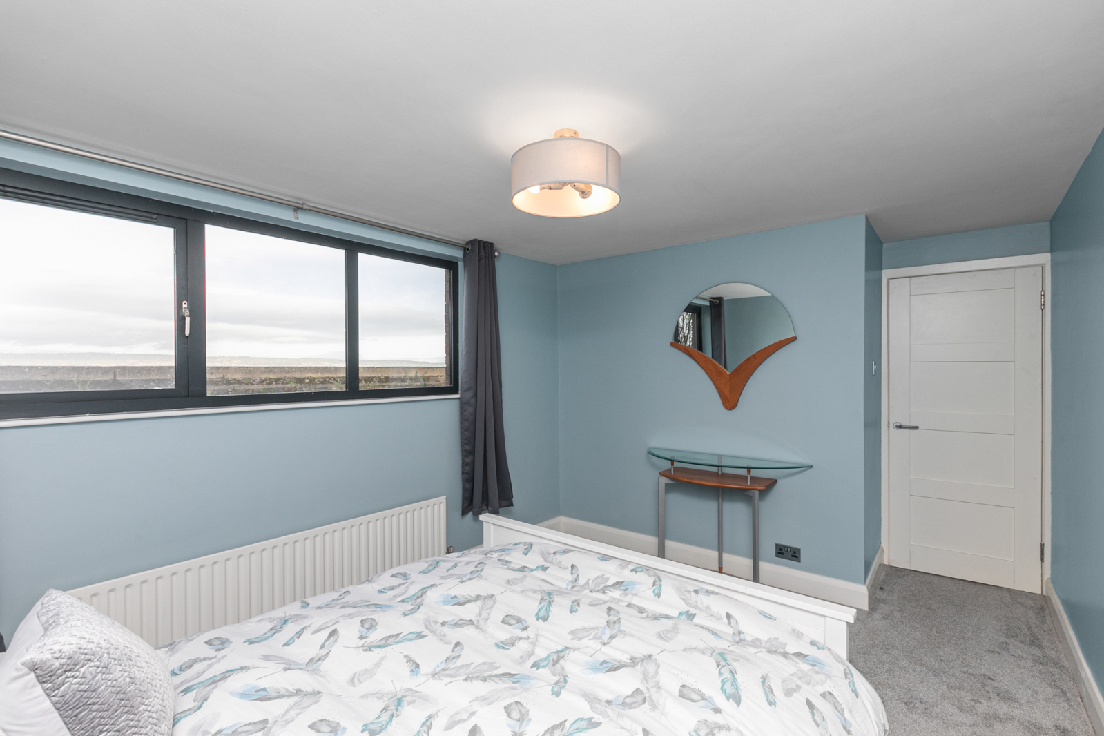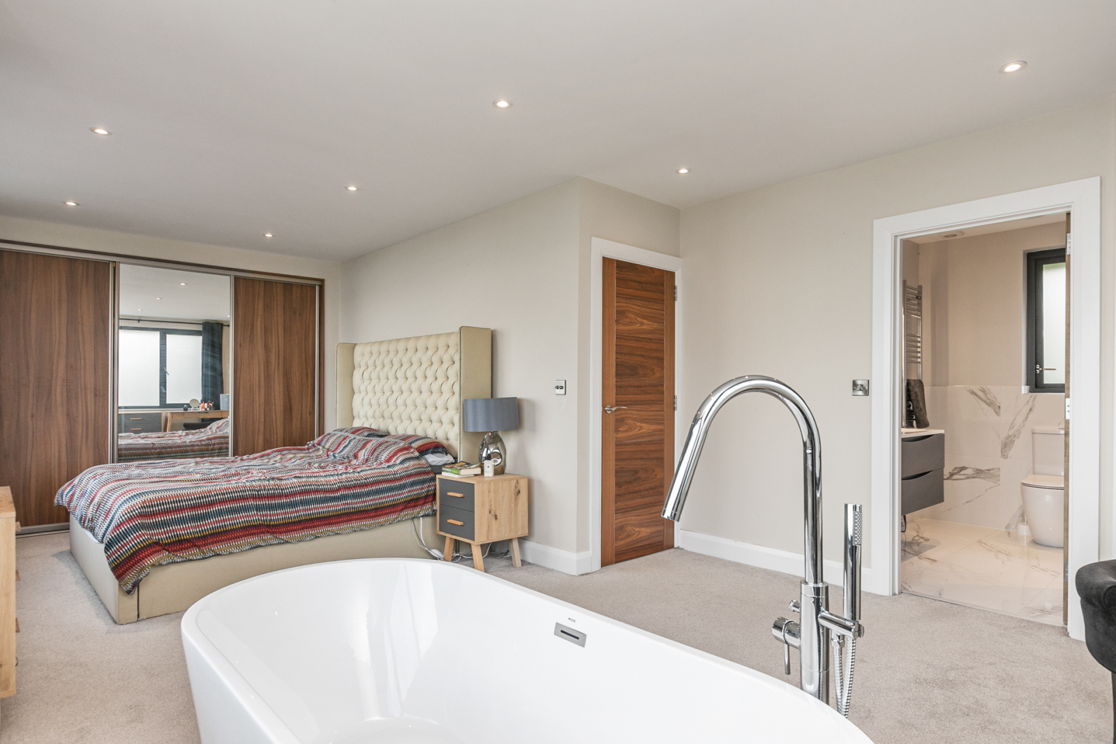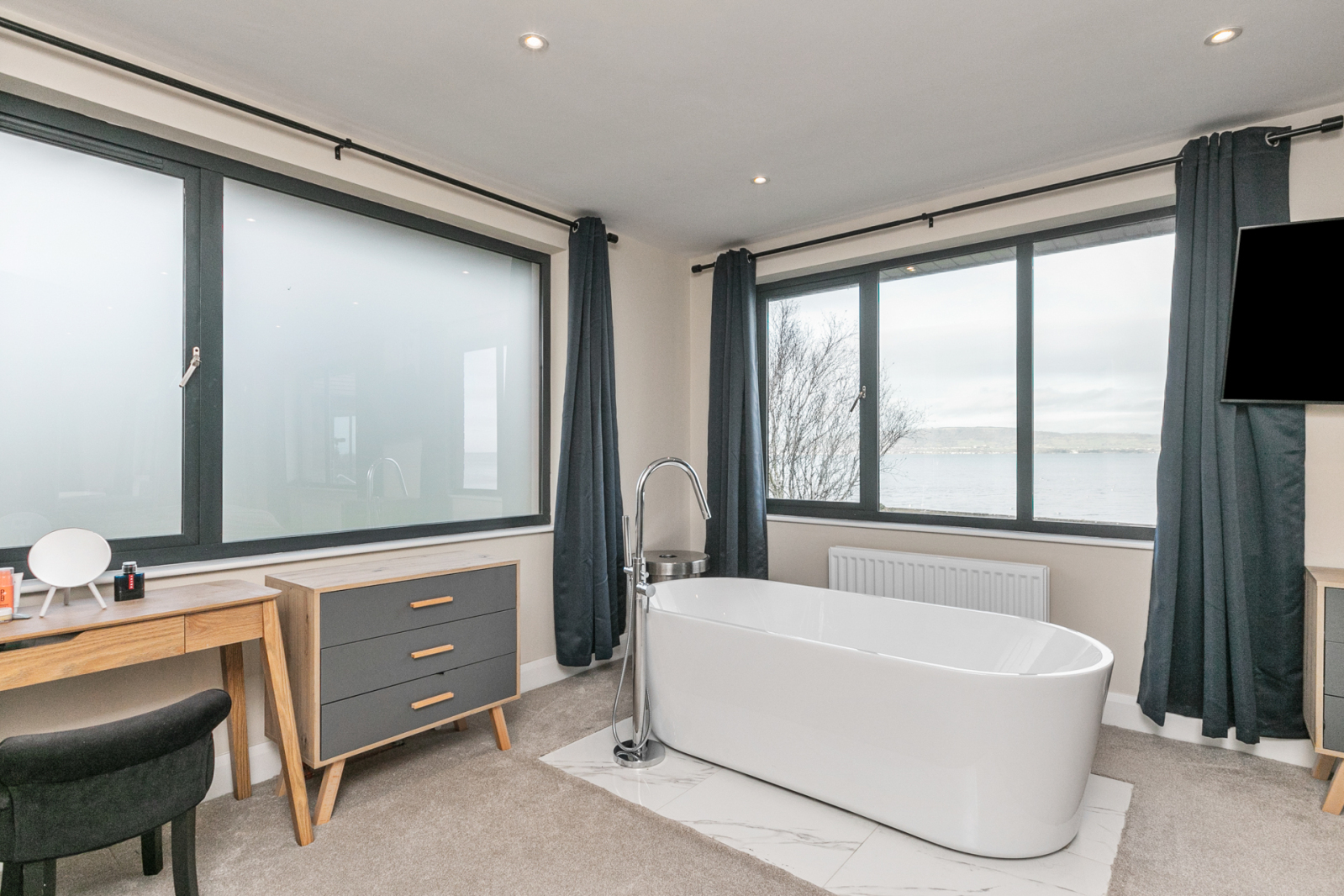 Fitted sliding wardrobes, freestanding bath with feature chrome mixer tap and tiled surround, panoramic sea views. Built in shelving, low voltage spot lights.