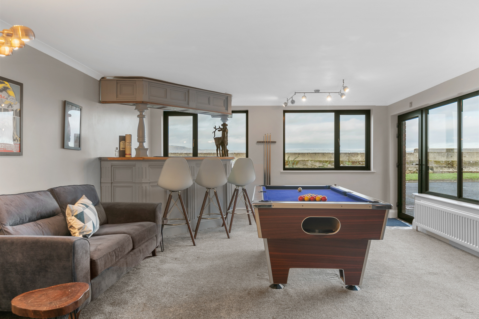 Bar, pool table, uPVC double glazed door to front. Feature fireplace with tiled hearth, cast iron gas stove. Sea views.