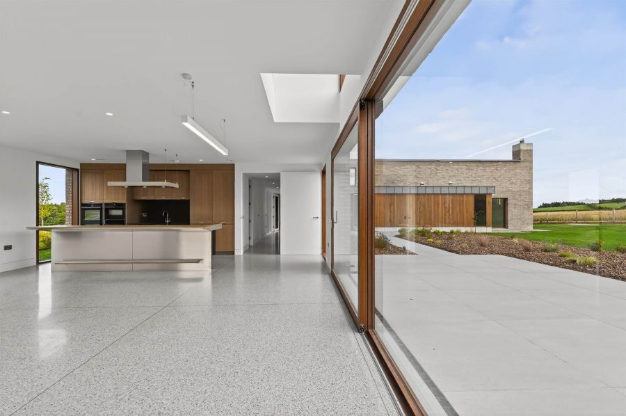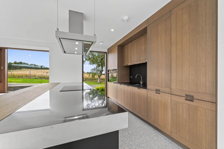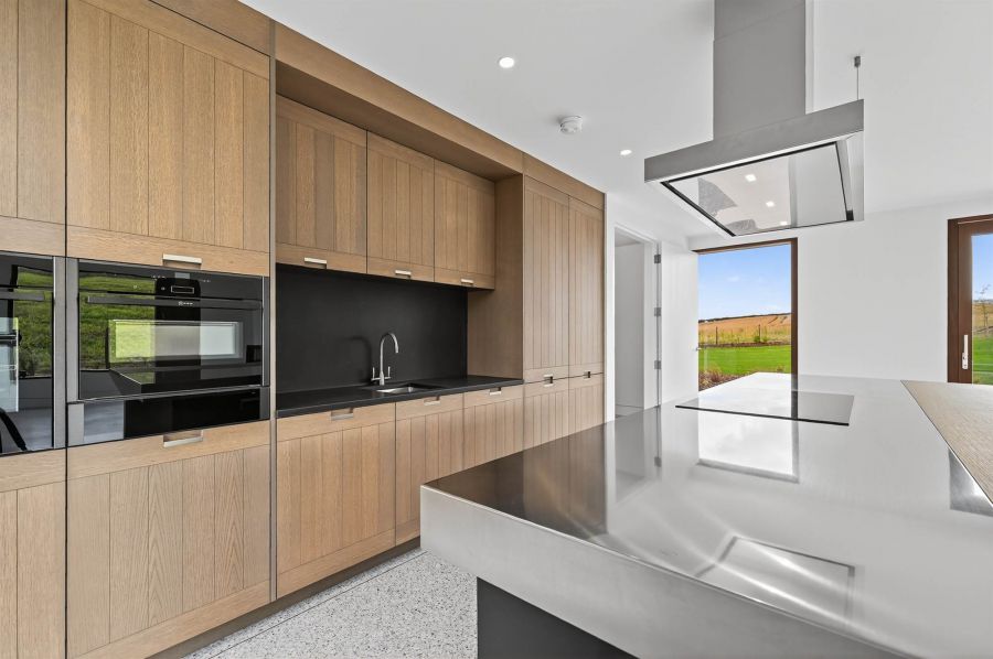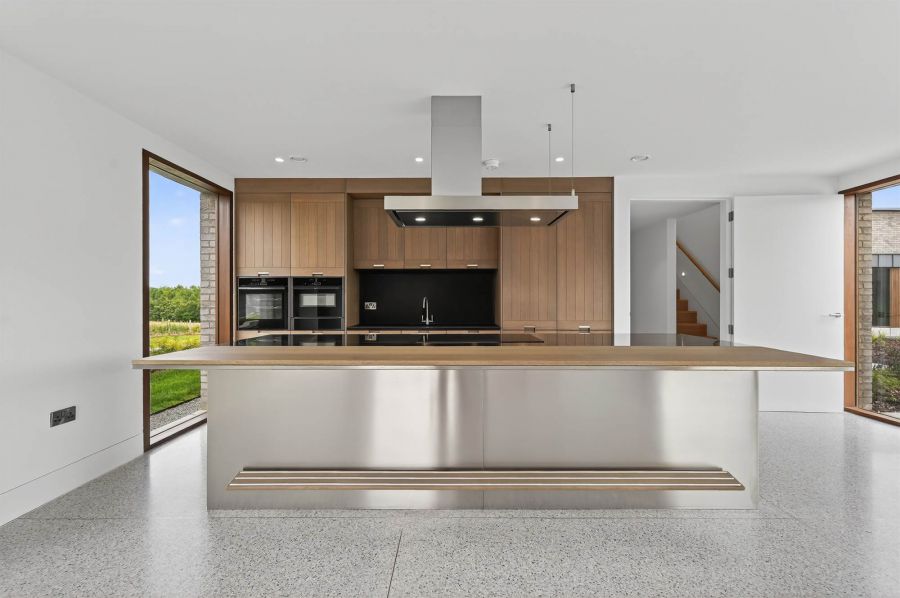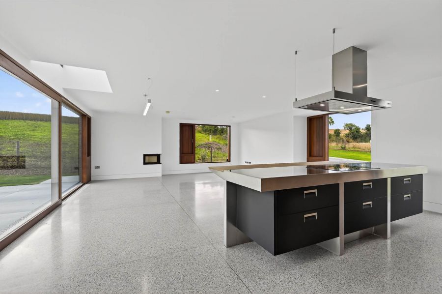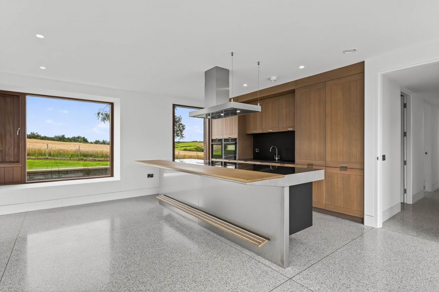 Bespoke Italian 'Arelinea' kitchen in two-tone smoked wood with extensive built-in Neff appliances, floating pierless island with stainless steel worktop and extractor, and breakfast bar with integrated footrests. Twin sinks, black Quartz worktops, matching splashbacks, and a concealed recycling drawer. Terrazzo flooring, large picture window, and a glass-fronted "Contura" multi-fuel stove. Sliding patio doors lead to a generous south-facing terrace and garden.