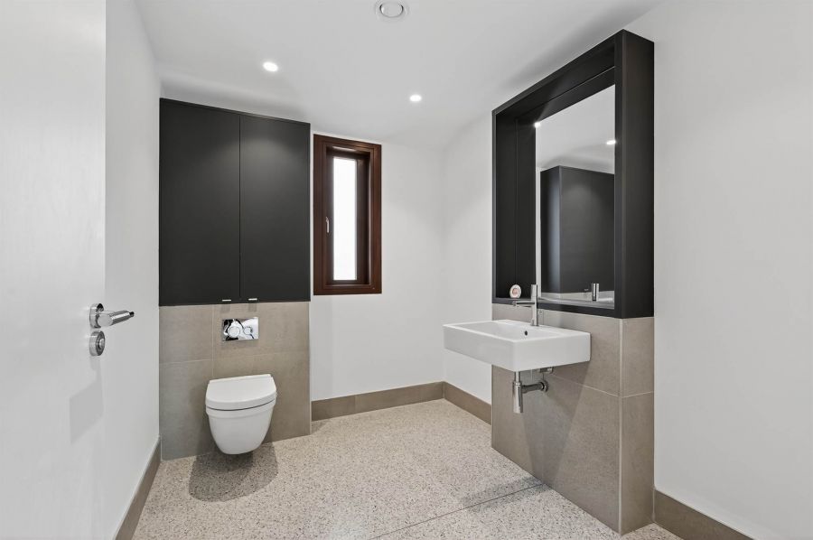 Stylish Duravit suite including wall-mounted sink with mixer tap, inset mirror with wooden surround, wall-hung low flush WC with Geberit concealed cistern, tiled splashback and storage, Terrazzo flooring and tiled skirting. Extractor fan and low voltage lighting.