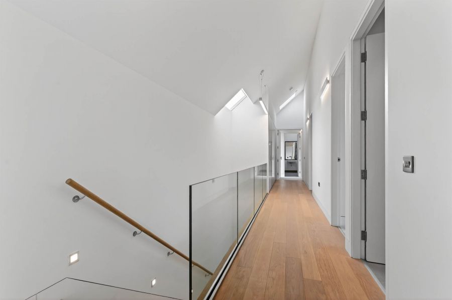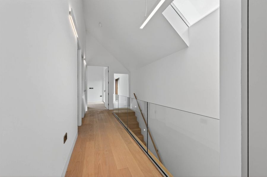Vaulted ceiling with two Velux windows, glass balustrade, limed oak flooring, feature lighting and extensive walk-in storage cupboards.