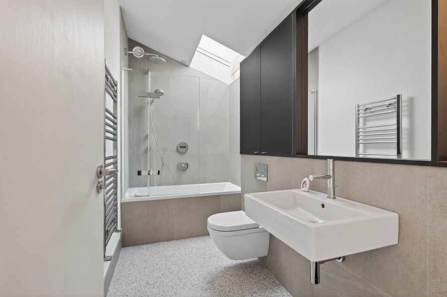 Contemporary suite including Axor deep-fill bath with Matki shower screen, drencher and telephone shower. Duravit WC with Geberit concealed cistern, charcoal-finished cabinetry, inset mirror, heated towel rail, Velux window, and Terrazzo flooring.