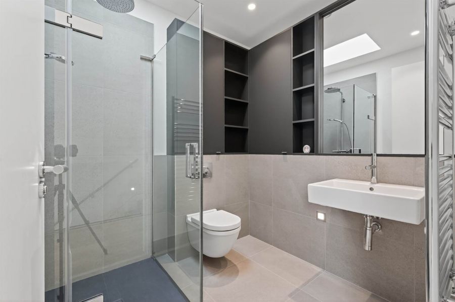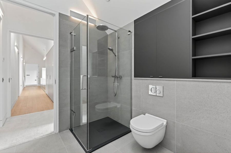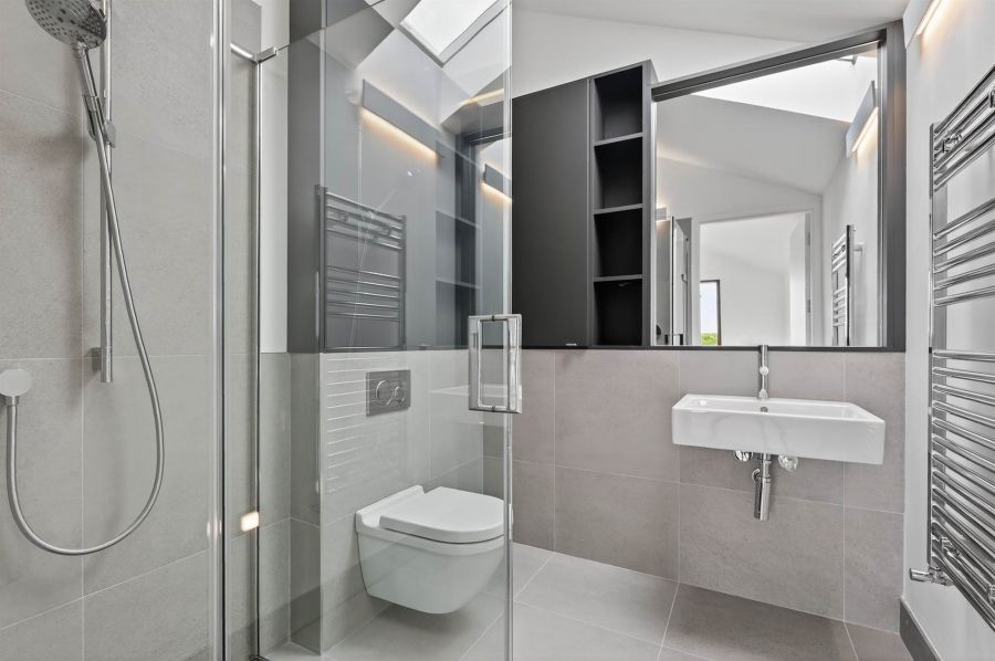 Generous shower with drencher and handset, Duravit WC and sink with mixer tap, bespoke cabinetry, ceramic tiled floor, part tiled walls, heated towel rail and Velux window.