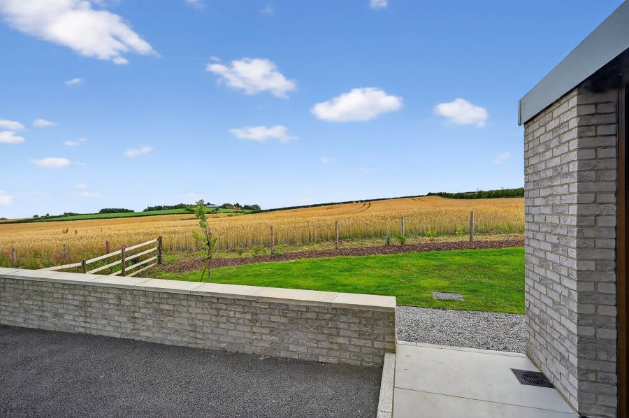Generous south-facing terrace laid in large-format tiles, bordered by well-stocked flowerbeds and granite-edged gravel paths. Outdoor tap and mood lighting throughout. Tarmac driveway with parking for up to six cars. Extensive lawns to front and rear with open countryside as a backdrop. Accessed via a private shared laneway with two sets of electric gates.