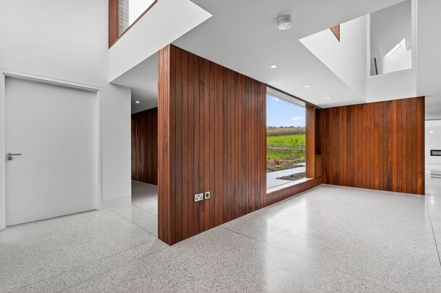 A dramatic double-height atrium with part Iroko-panelled walls, full-height picture window overlooking the rear garden, and concealed staircase with limed oak treads. Finished with border-detailed Terrazzo flooring, low voltage lighting, and a built-in understairs cupboard housing underfloor heating manifolds and the communication hub. Access to the rear garden and integral garage.