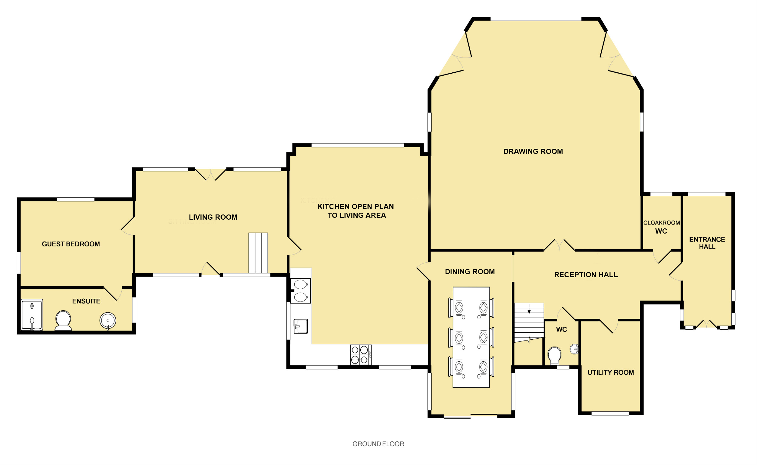 The accommodation on the ground floor comprises: four reception rooms, kitchen, garden room leading to rear patios and gardens, guest bedroom suite with shower room, utility room, WC, and cloakroom.