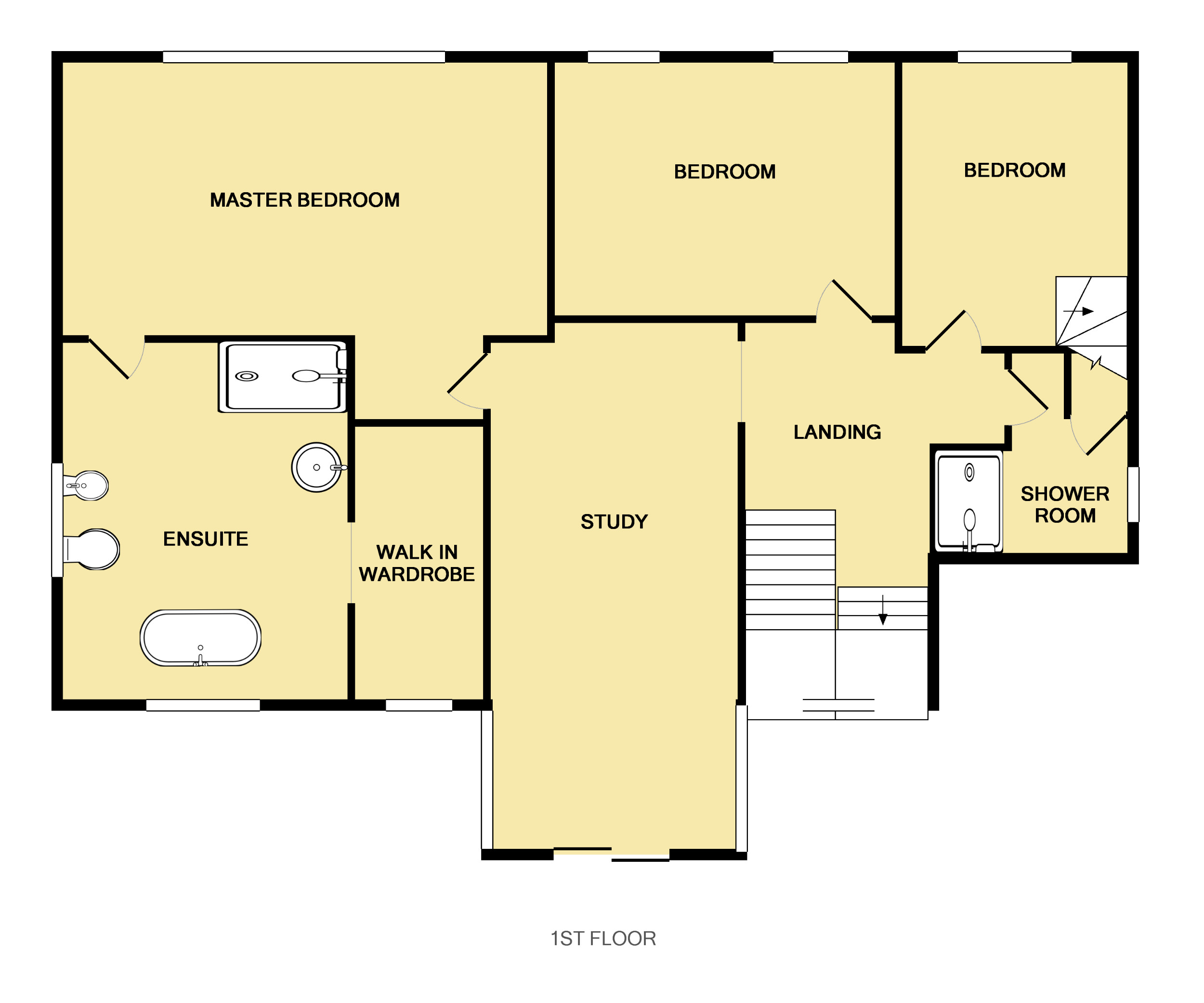The first floor consists of: an open plan study / reading area; principal bedroom with ensuite bathroom and dressing room; a family shower room and two further bedrooms, one of which is a duplex bedroom with dressing area.