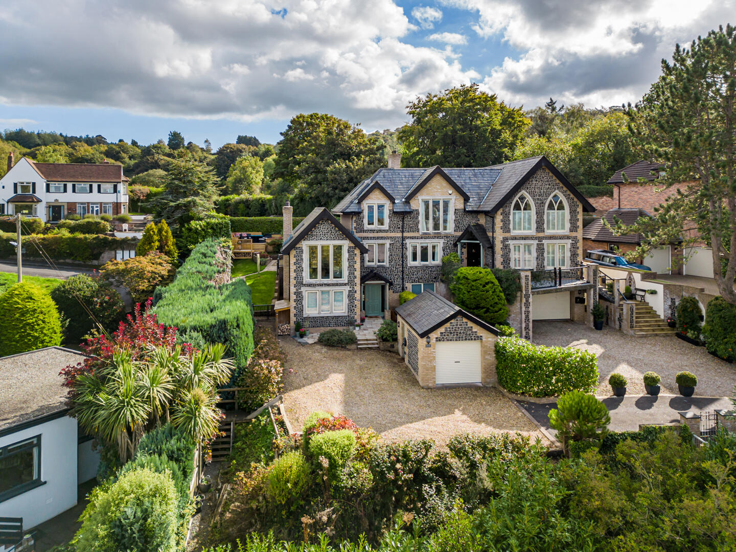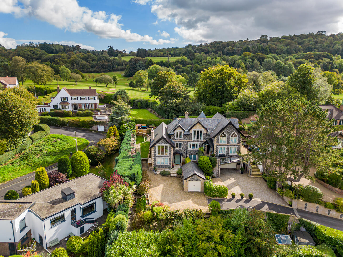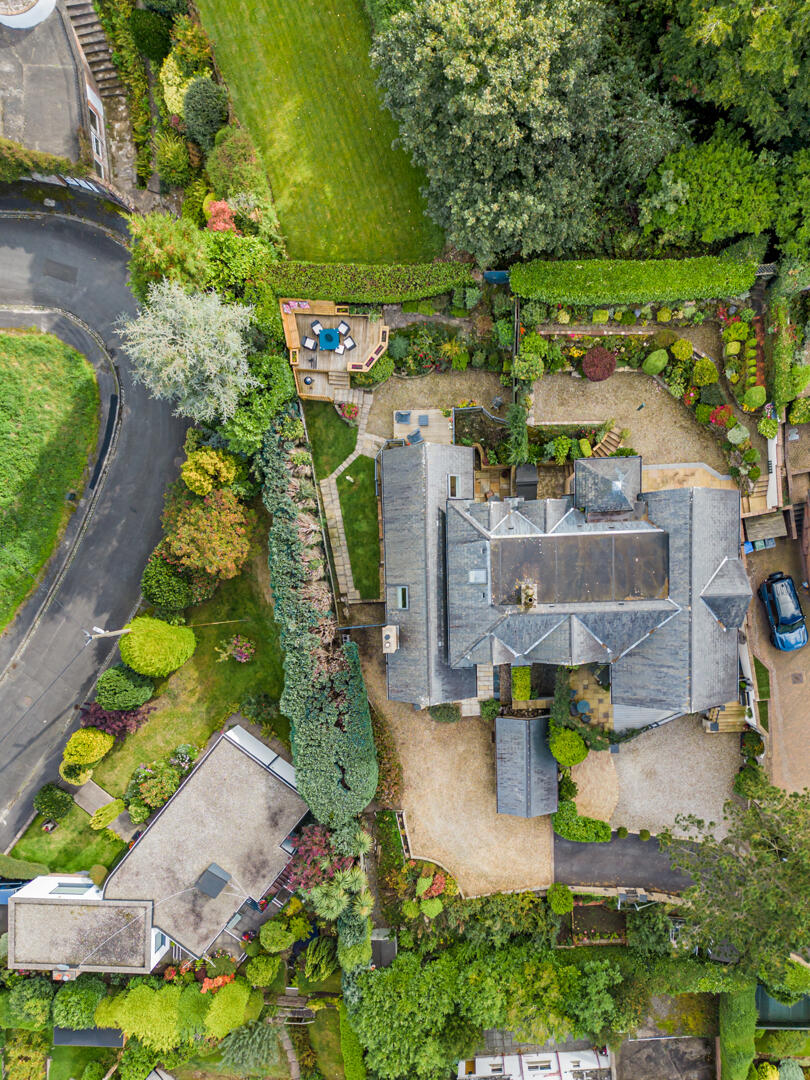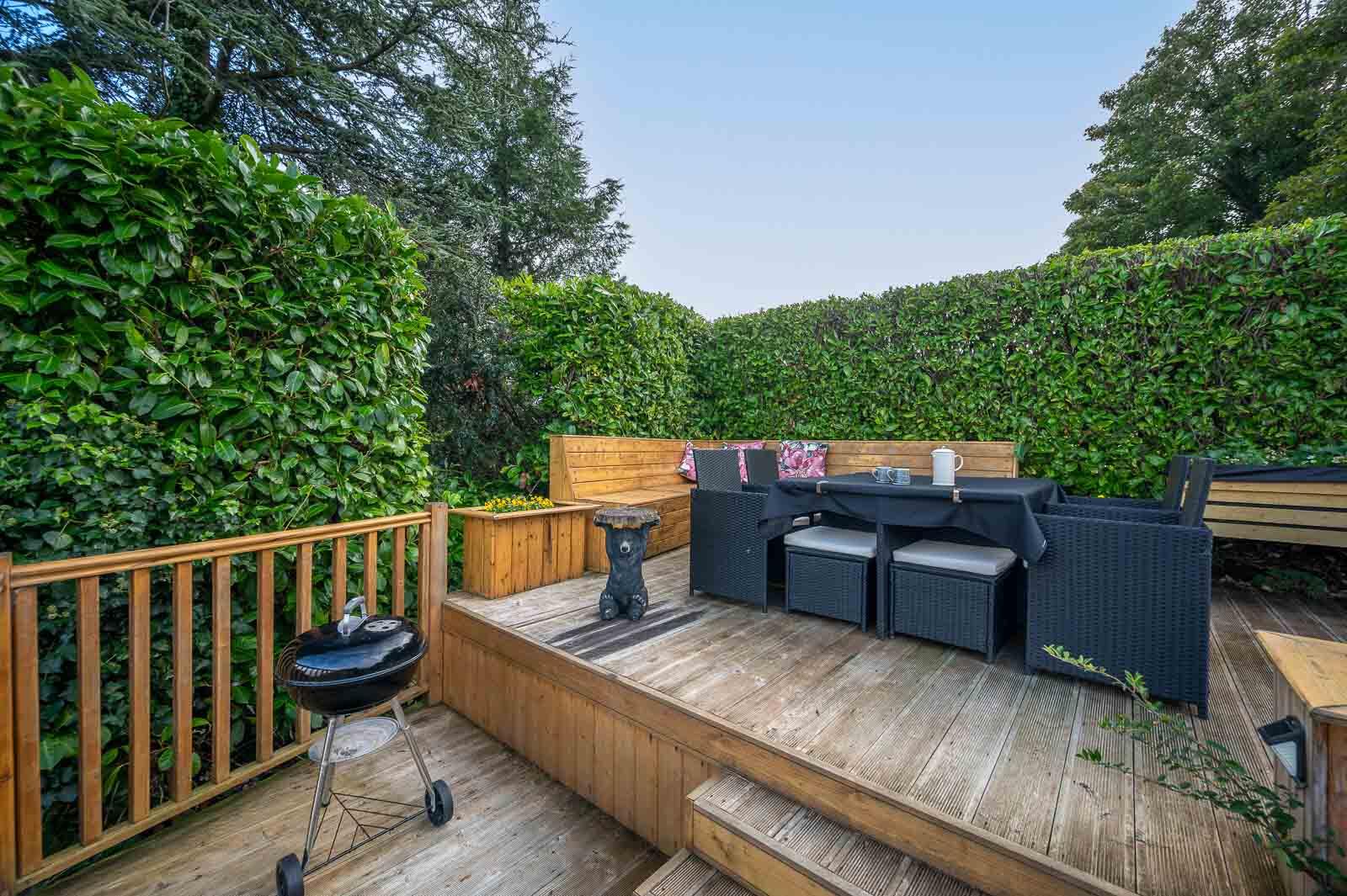 Outside, the gardens have been designed for low maintenance yet maximum enjoyment, with terraces, lawns, flowerbeds, and decked seating areas - perfect for evening sunsets. To the front there is driveway parking, a detached garage, EV charger, and steps leading to a lower garden area.