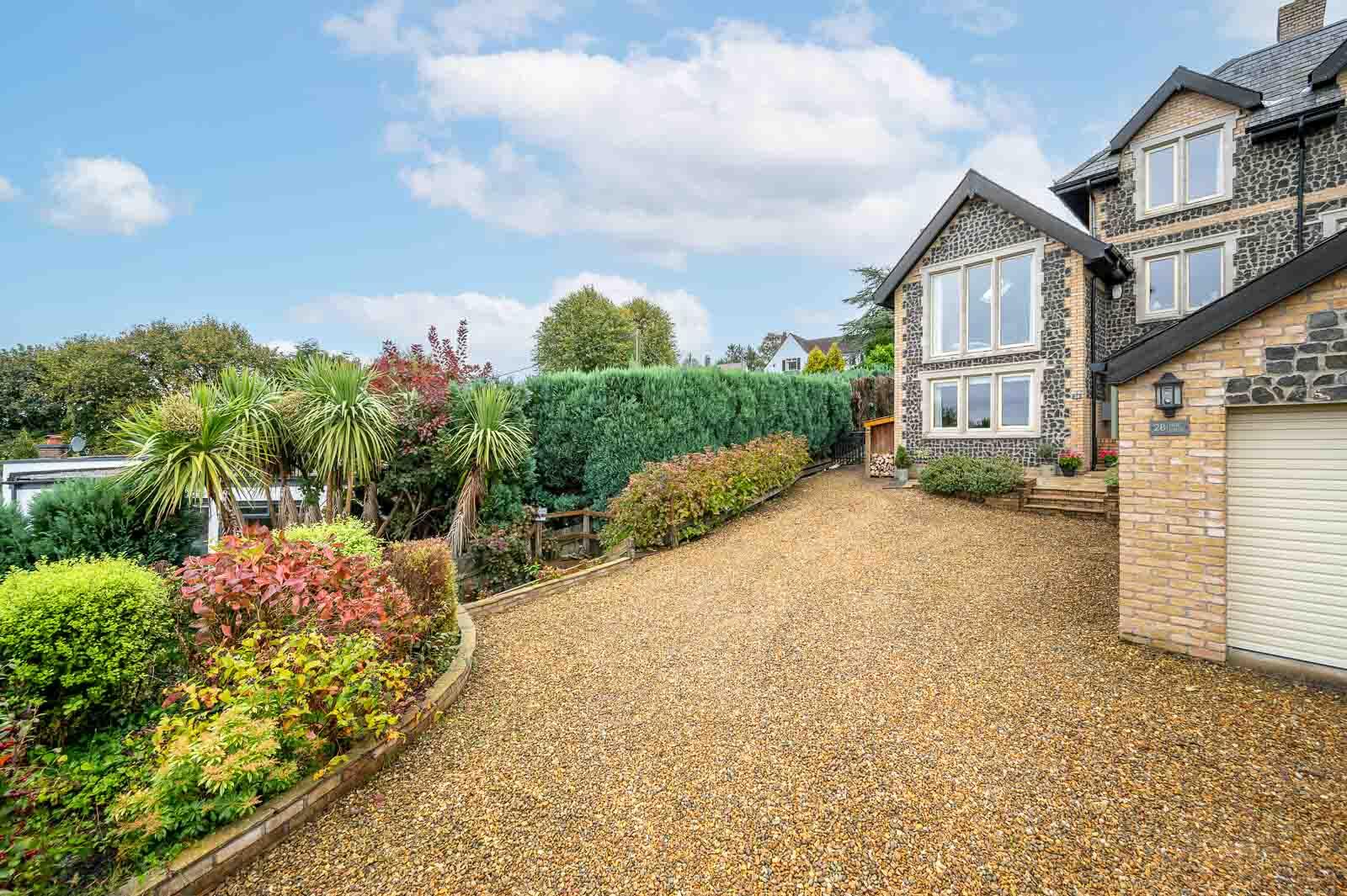 Parking laid in stones with detached garage, EV charger, water tap, sockets, steps leading down to lower garden with space for shed.