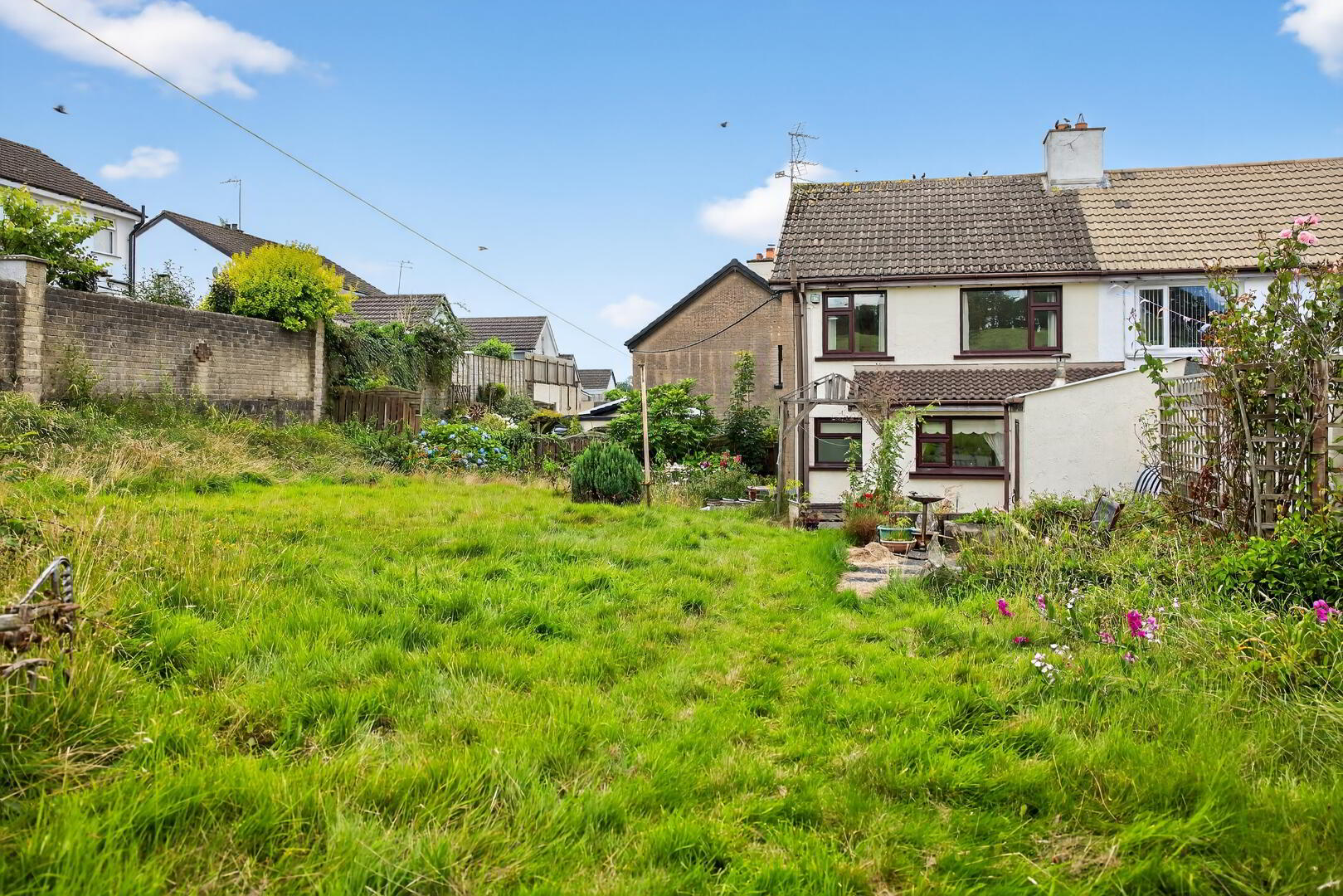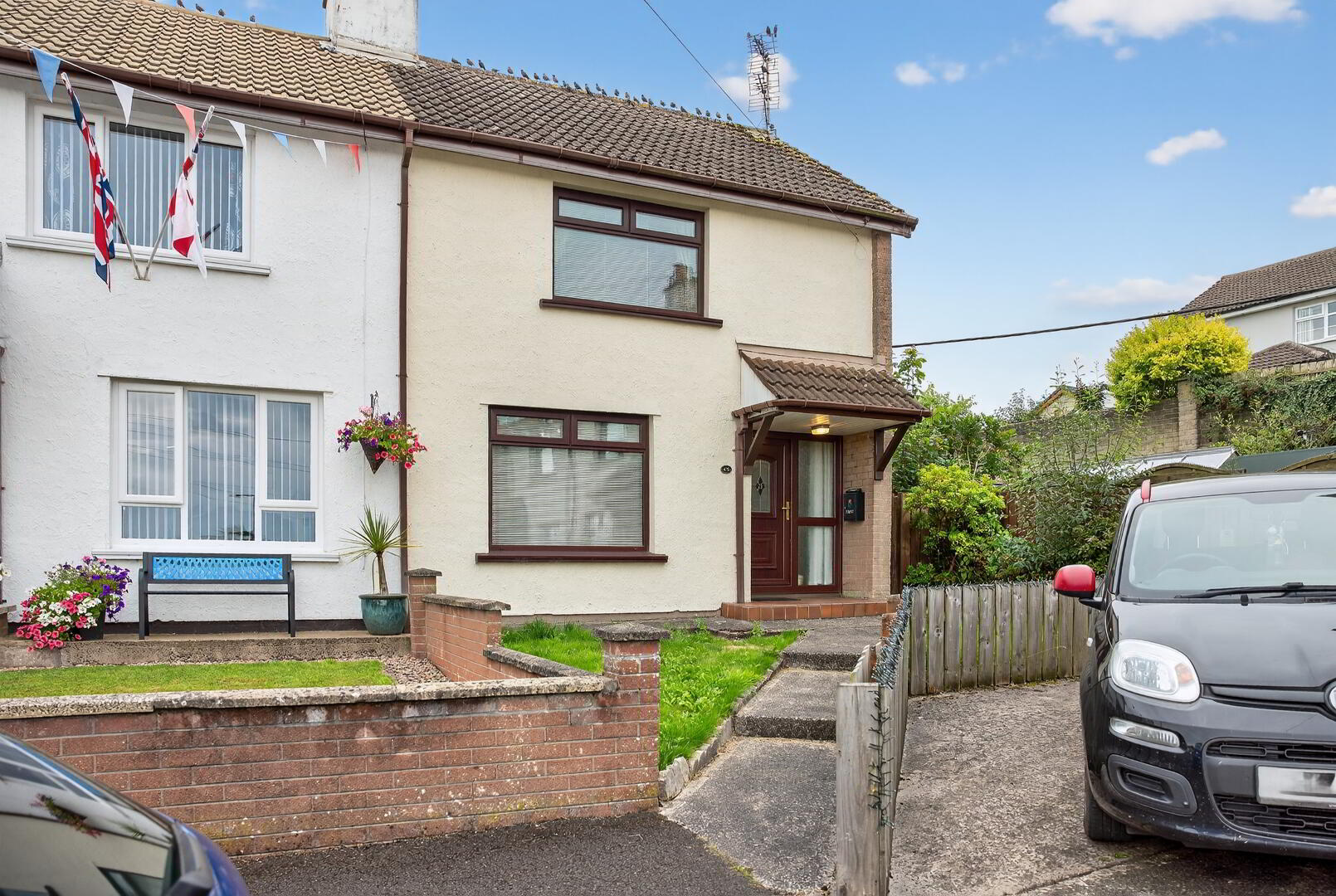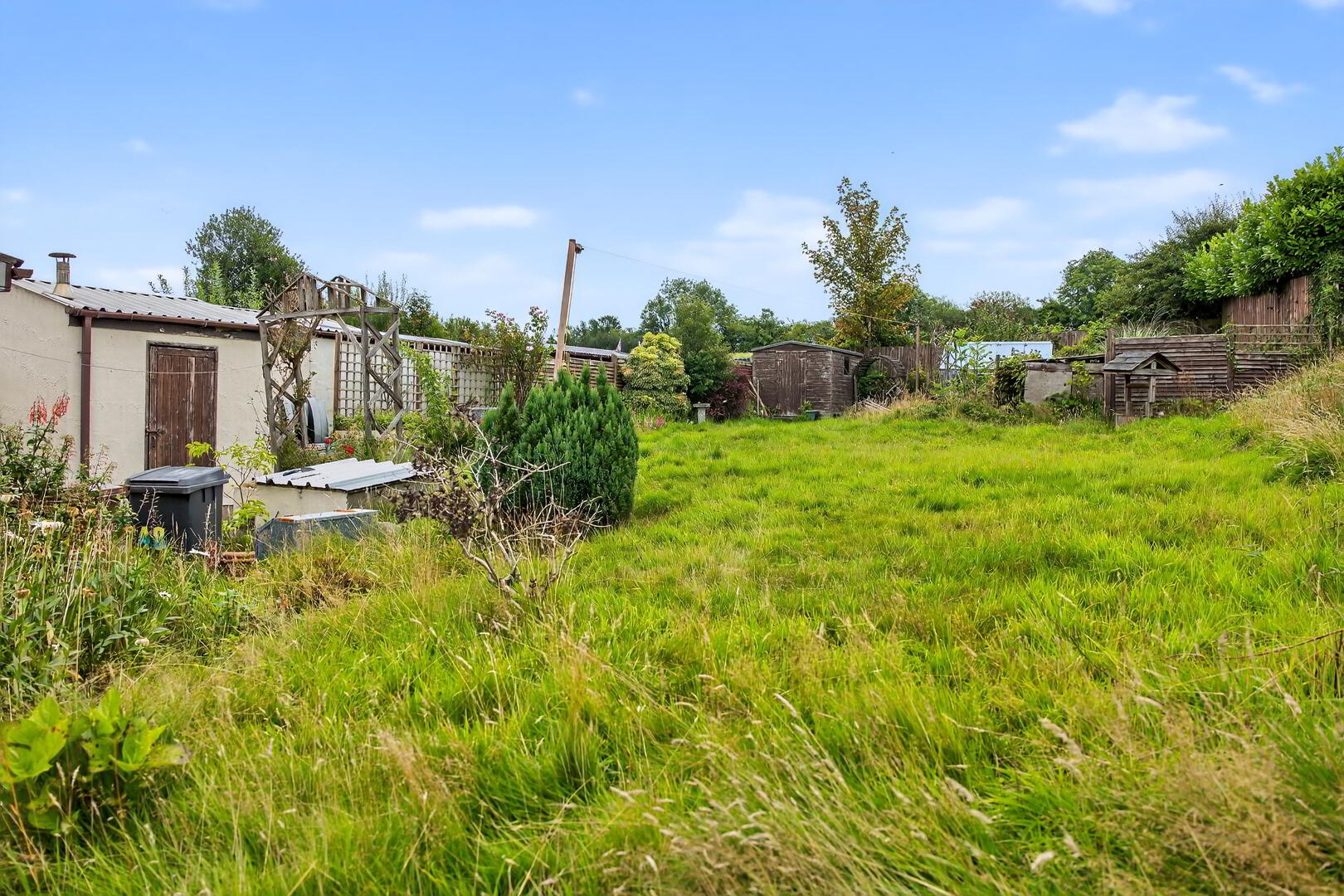 Concrete access path continuing to rear and opening to a concrete hardstanding