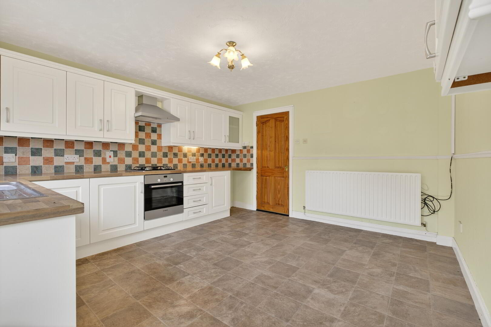 Range of high and low level units with beech effect wood block worktops including 4 ring hob, stainless steel canopy and extractor, Bosch low level fan assisted oven and grill, space for under counter fridge, space for washing machine or dishwasher, stainless steel single drainer unit and mixer tap, under unit lighting, partly tiled surround, dado rail, door to exterior