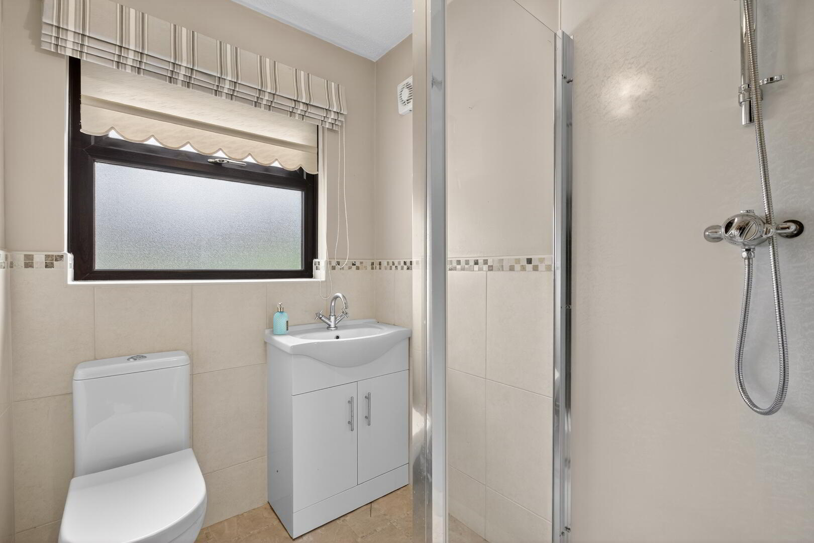 Comprising shower cubicle completed in marine boarding with shower unit off mains, vanity unit with counter top basin and mixer tap, back to wall low flush wc, half tiled walls