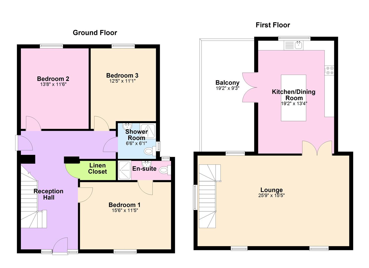 Internally the first floor accommodation comprises modern open plan kitchen and dining area with patio doors to the sizeable balcony area and large, double aspect lounge, while the ground floor boasts the family shower room. three double bedrooms including principle en-suite.