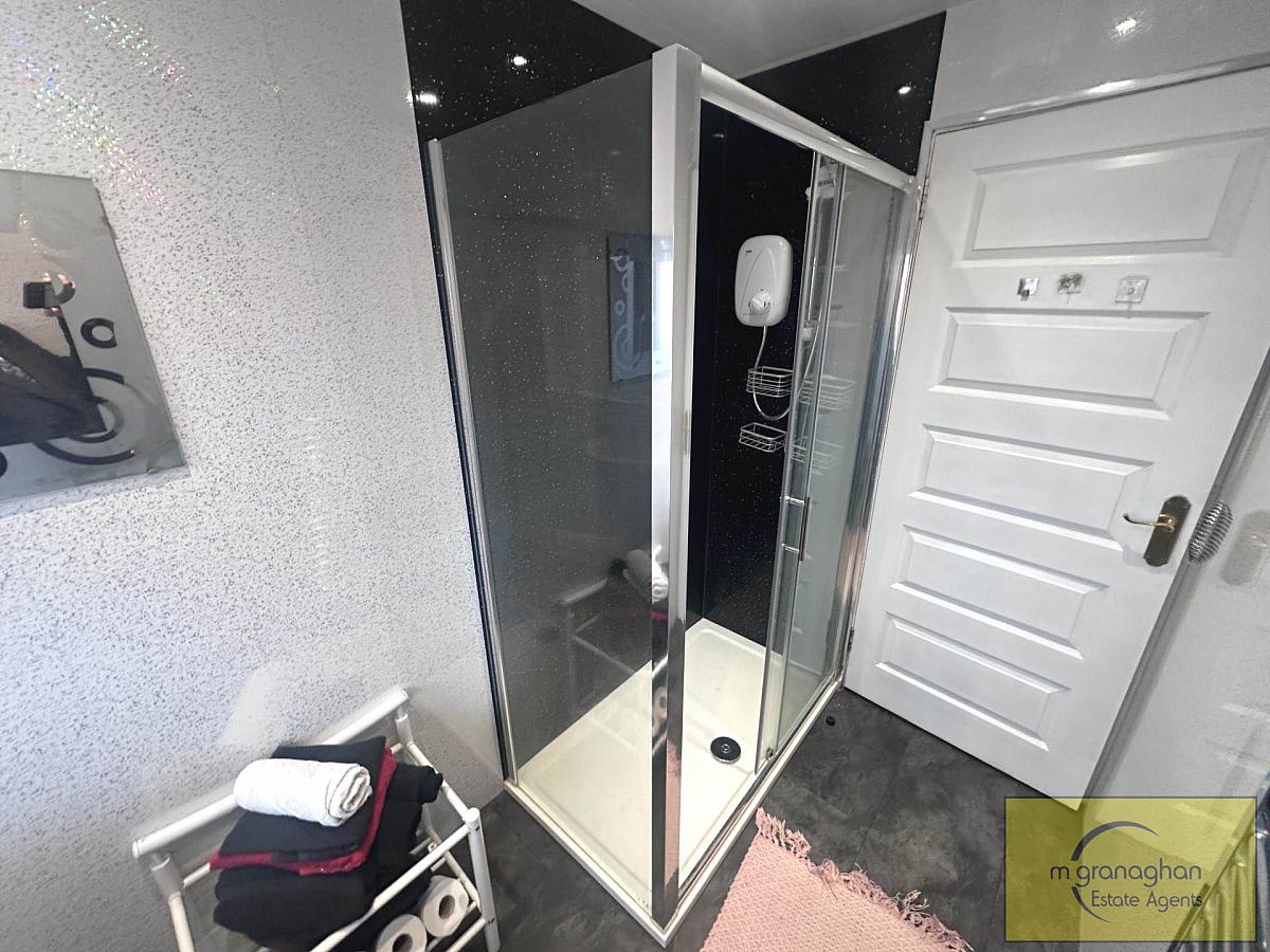 White suite comprising ofwalk in shower wall shower, vanity unit wash hand basin, low flush WC, tongue and groove white ceiling, ceiling spots, PVC wall panelling.
