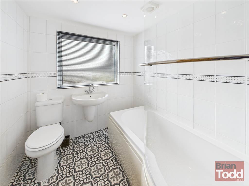 Modern white suite incorporating panelled bath with shower attachment and mixer taps, low level W.C. and pedestal wash hand basin. Tiling.