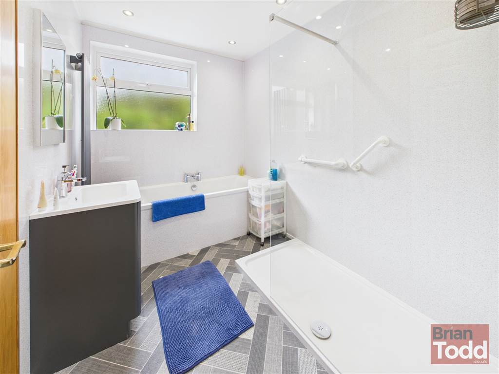 Incorporating vanity wash hand basin, panelled bath and separate shower cubicle with electric shower.