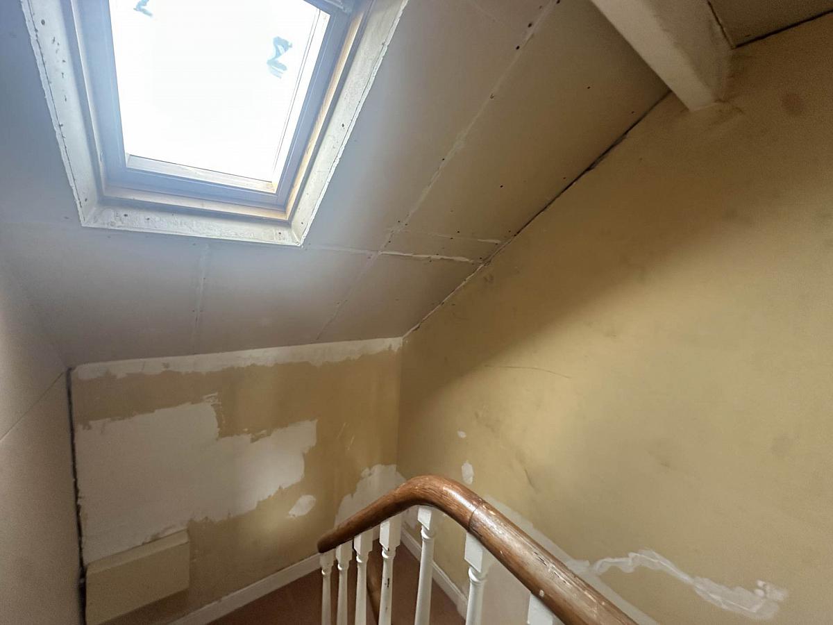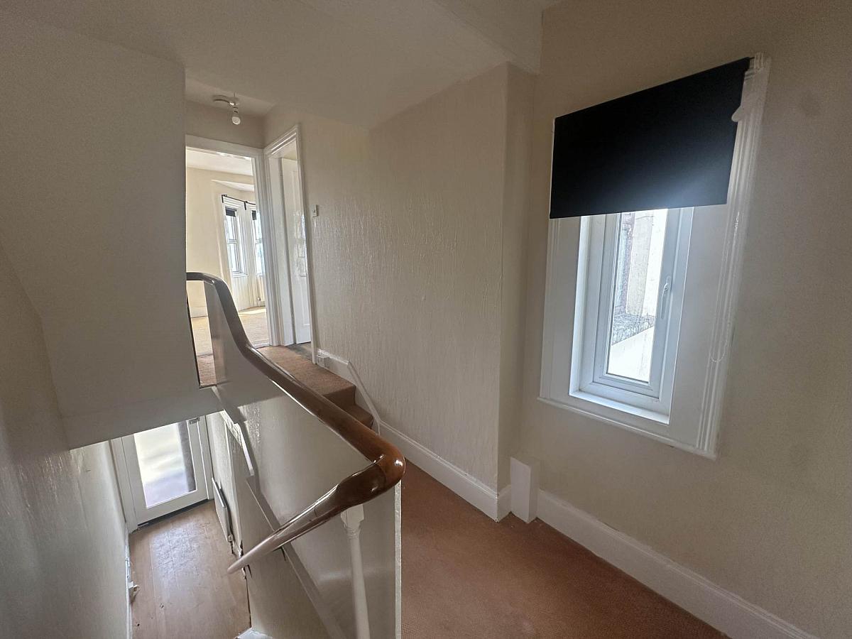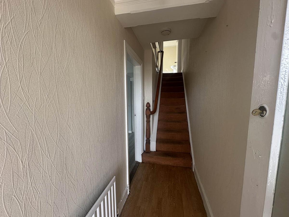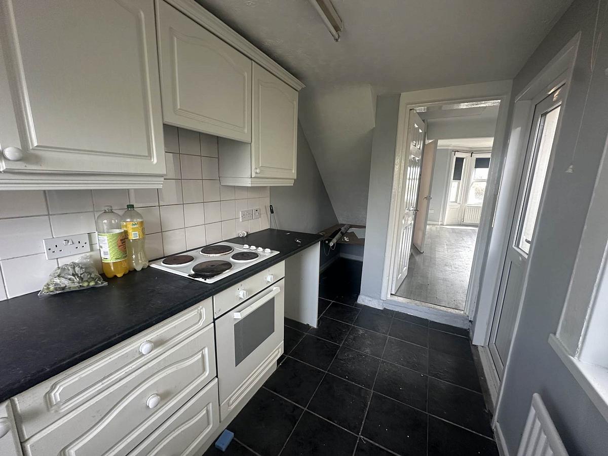 High & low level units. Laminate work tops. Single drainer stainless steel sink unit. Tiled floor. Space for storage under stairs. UPVC back door.