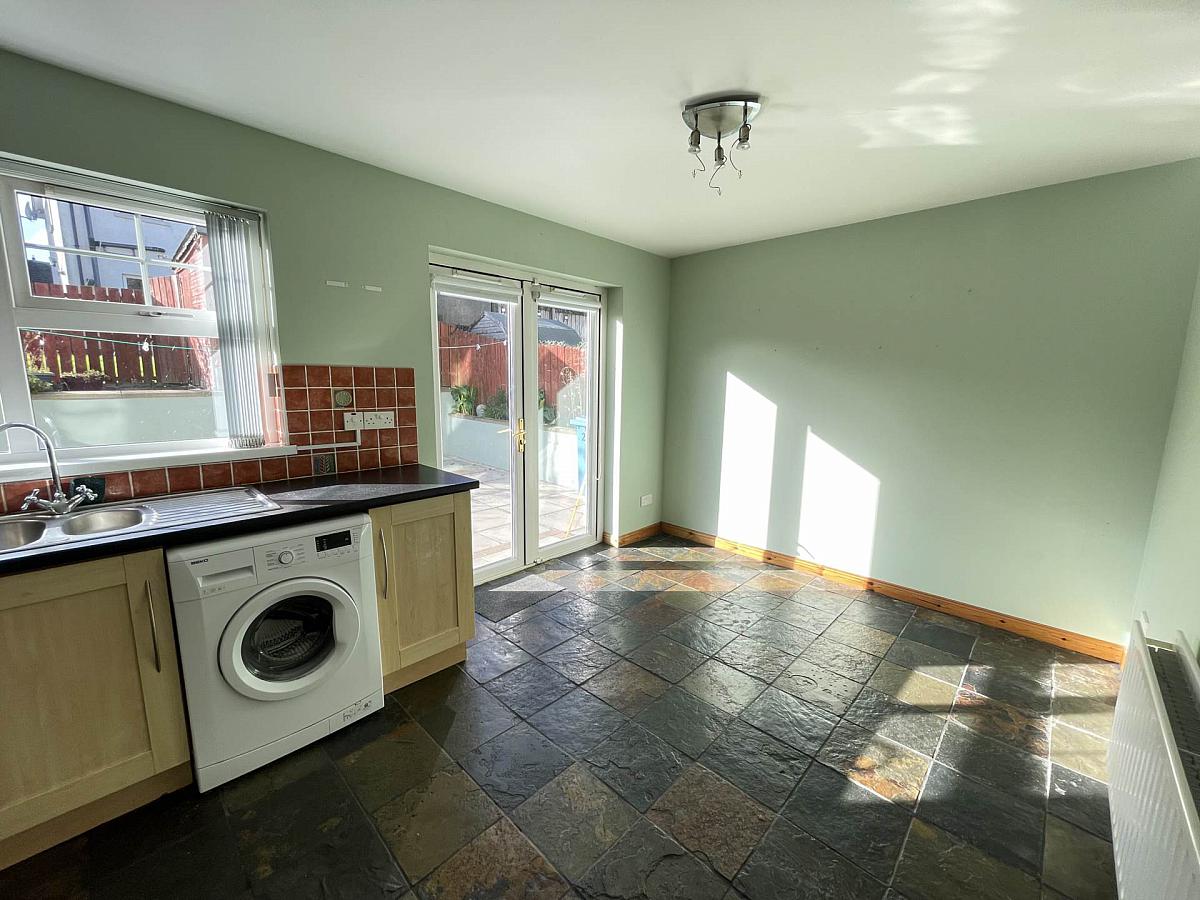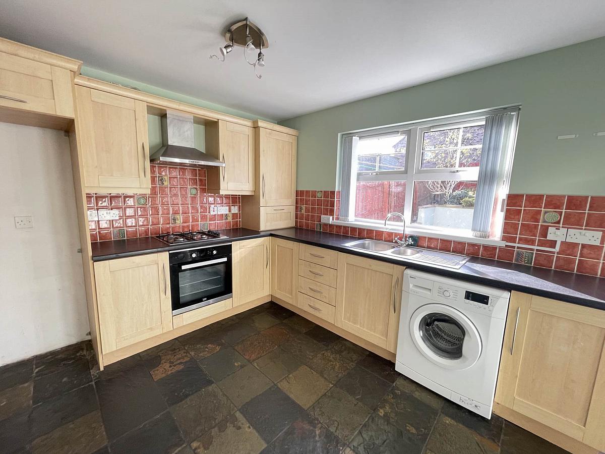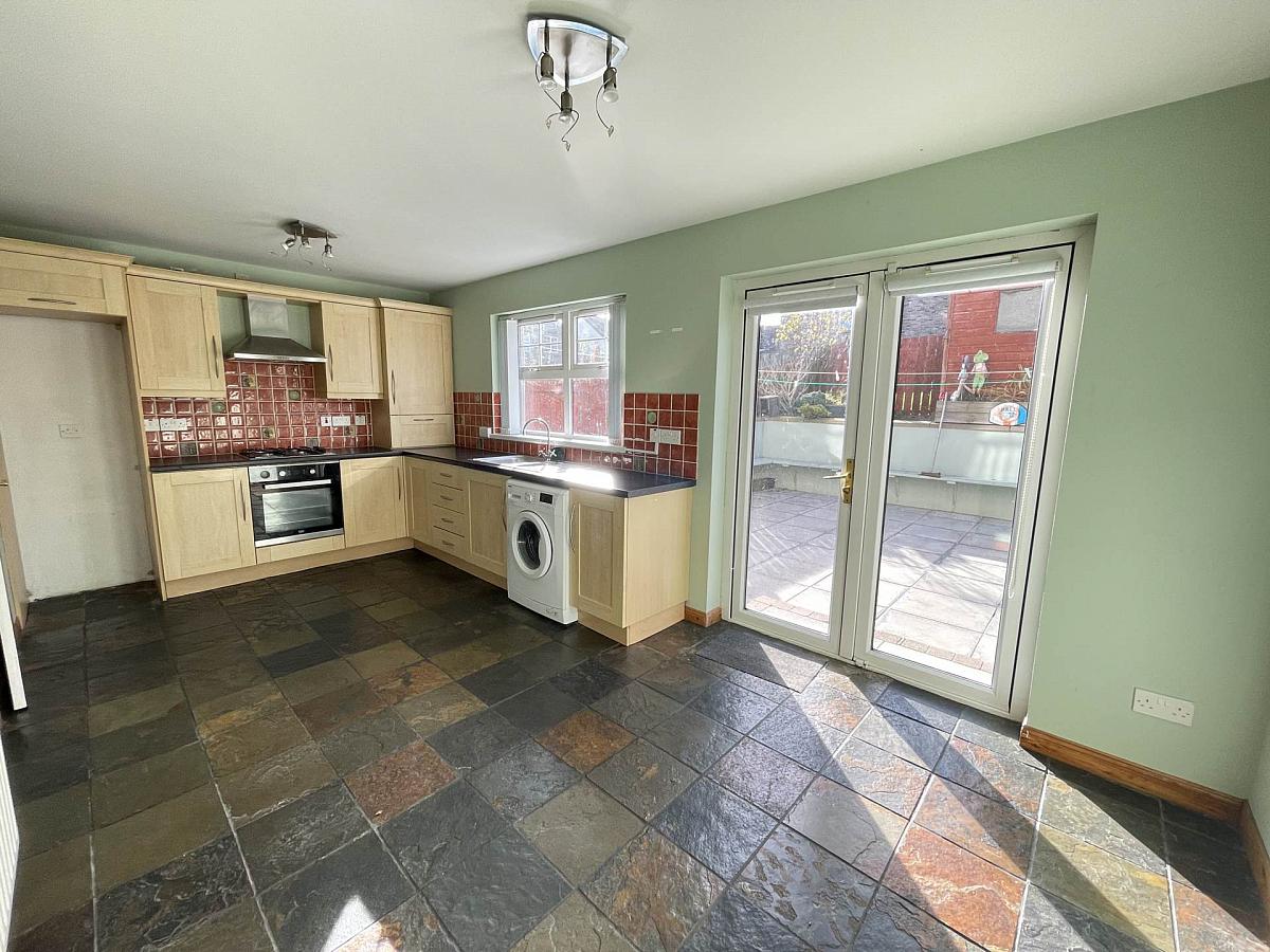 Range of high & low level units. Laminate work tops. Stainless steel single drainer sink unit with vegetable basin. Beko low level oven. Four ring gas hob unit. Cupboard housing gas boiler. Part tiled walls. Tiled floor. Double glazed patio doors.