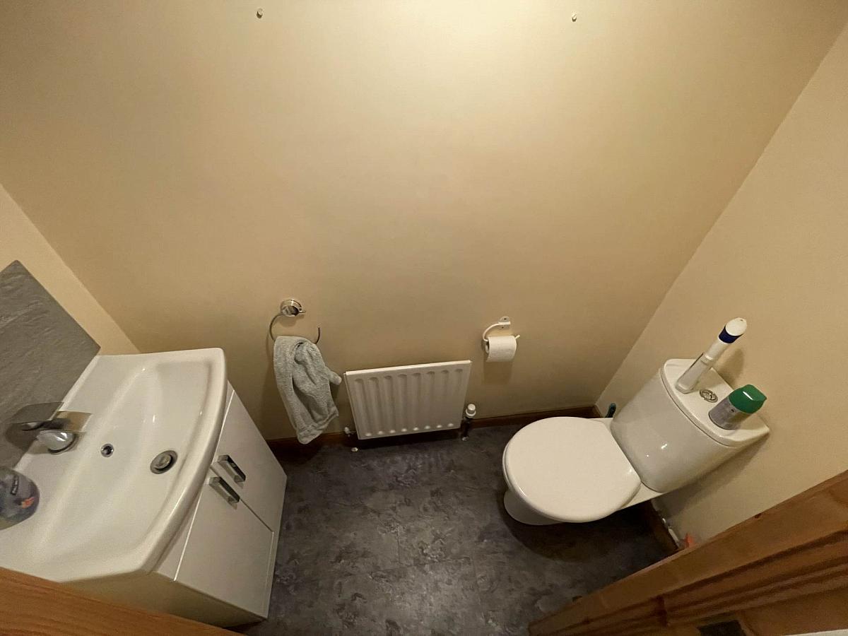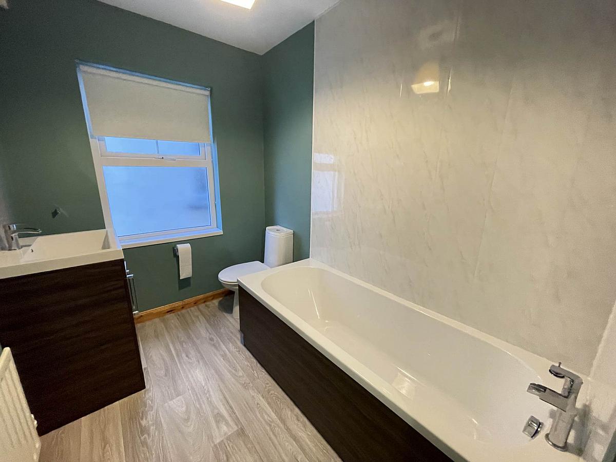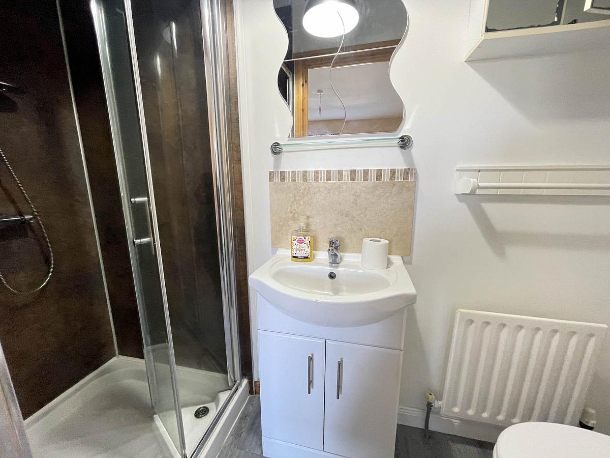 Low flush WC, vanity unit and shower cubicle with thermostatically controlled shower fitting.