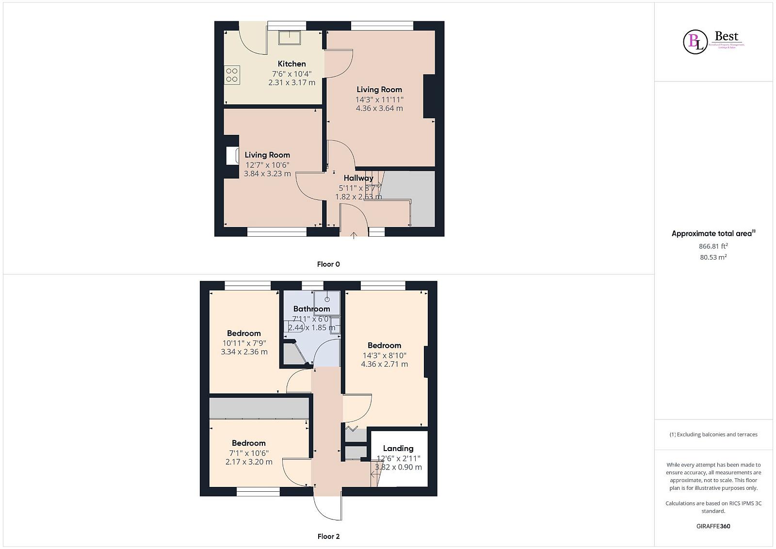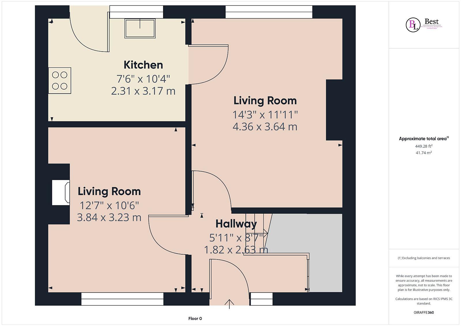 Living room w: 3.65m x l: 4.38m (w: 12' x l: 14' 4")
