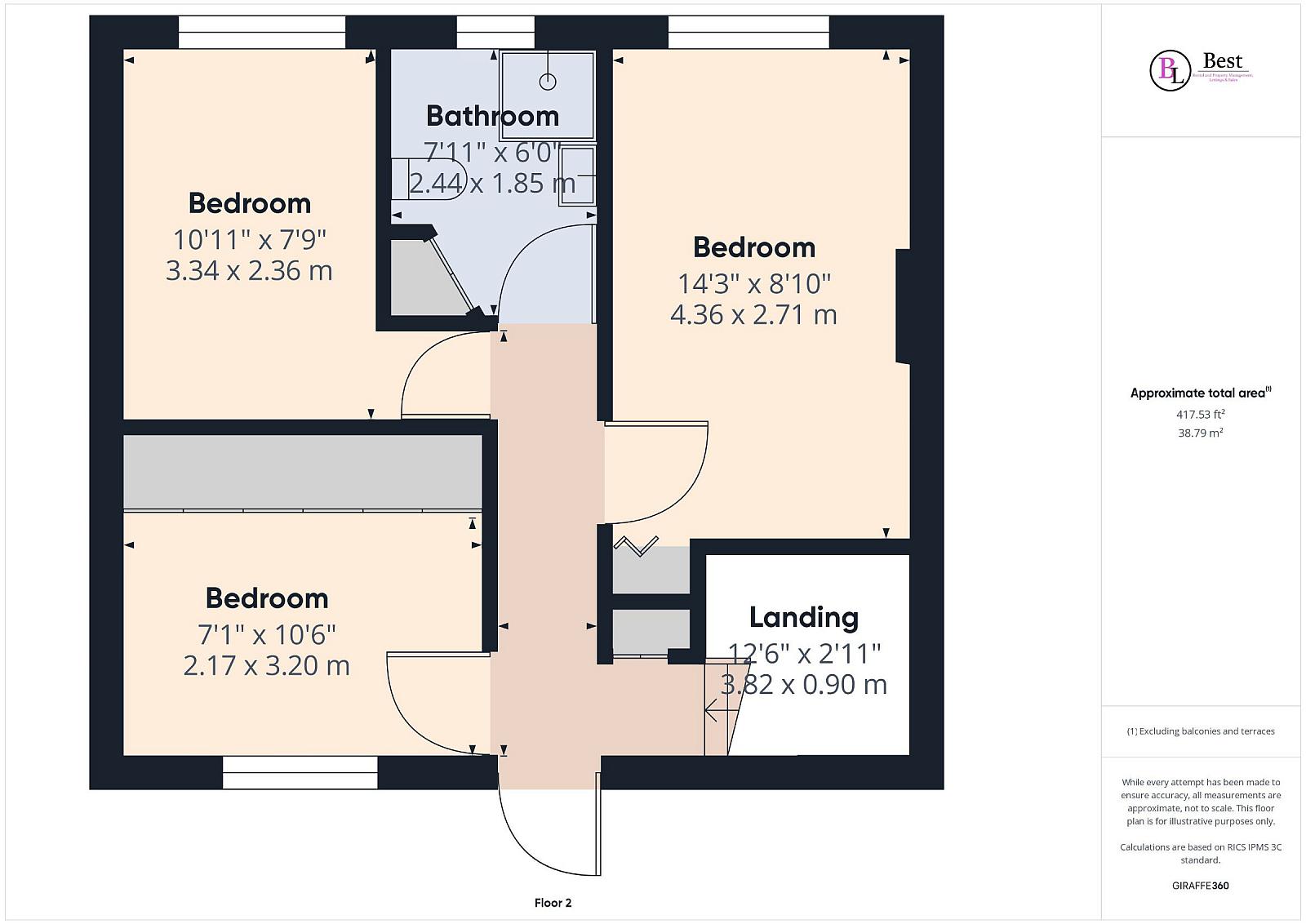 Bedroom 2 w: 3.36m x l: 3.28m (w: 11' x l: 10' 9")