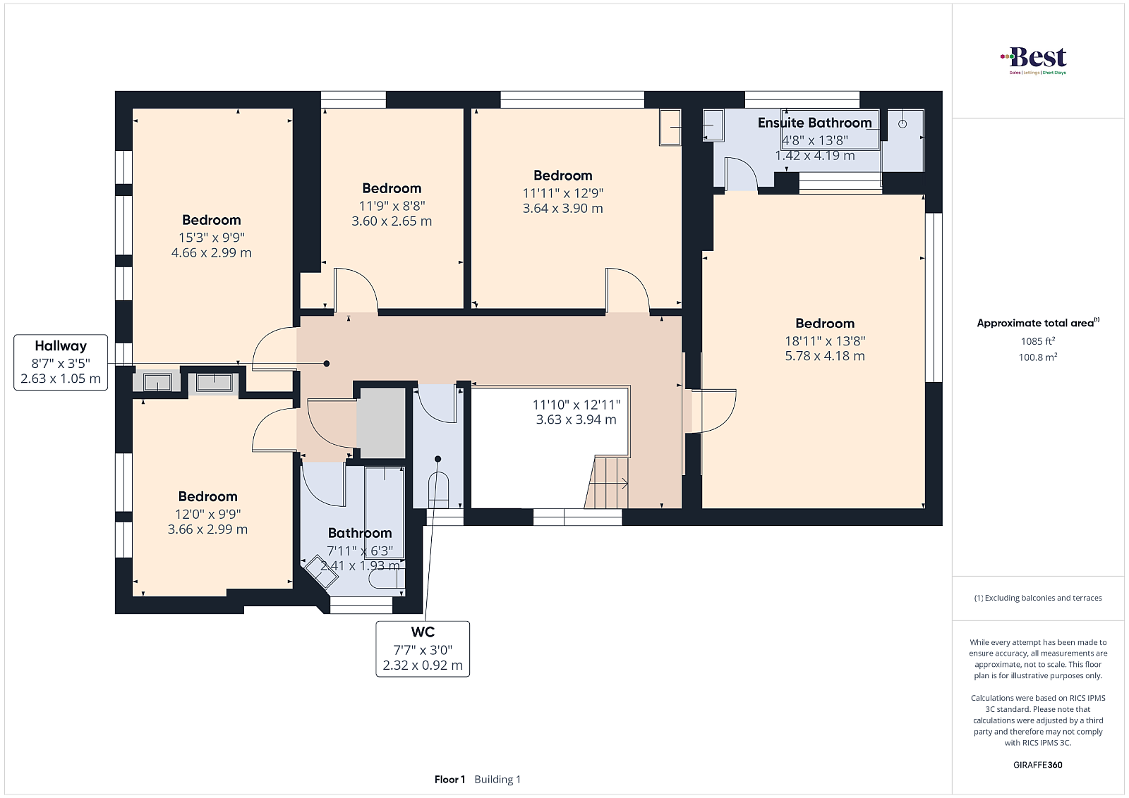 Bedroom 1 w: 3.32m x l: 3.3m (w: 10' 11" x l: 10' 10")