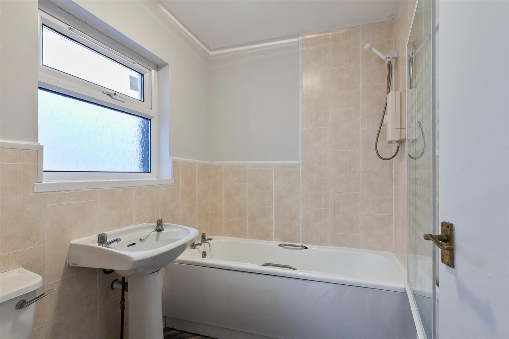 White, three piece suite comprising panelled bath, pedestal wash hand basin and WC. Electric shower and glass shower screen over bath. Tile effect panelling to walls.