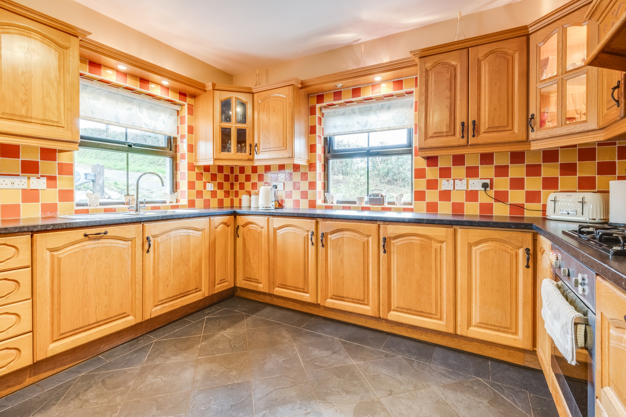 Fitted kitchen with a range of high & low level units, glazed display unit, s.s.sink unit integrated gas hob, electric oven & grill, dishwasher, fridge, extractor fan hood, tiled floor & splash back.