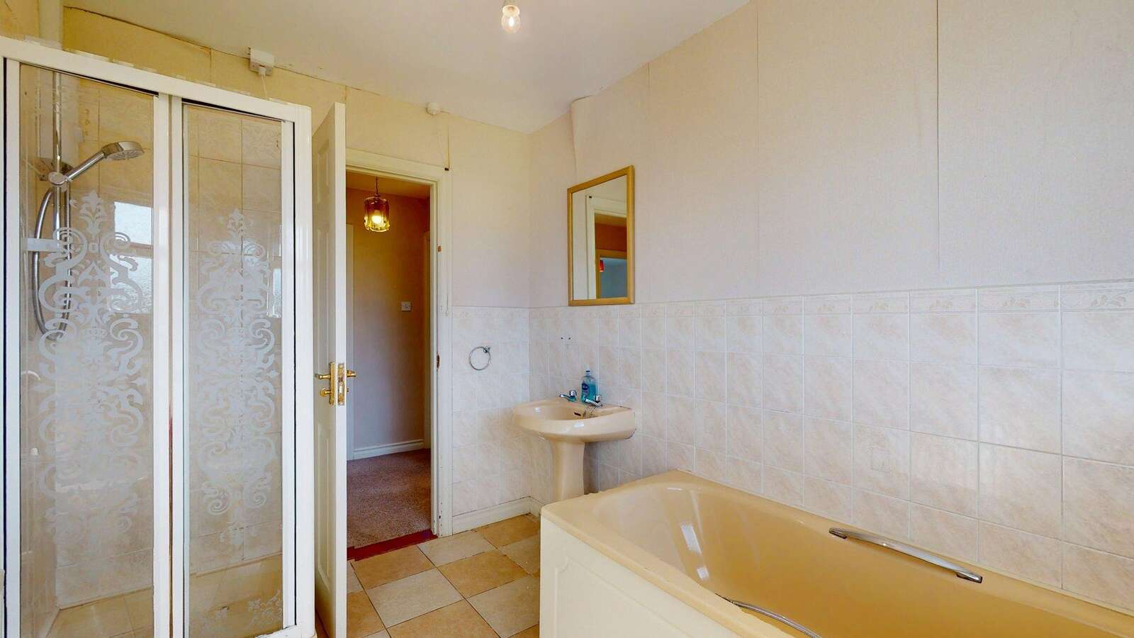 9'4 x 6'8 Coloured 4 piece suite comprising bath with mixer taps. Pedestal wash hand basin. Low flush w.c. Separate walk-in shower unit with MIRA SPORT Electric shower. Half tiled walls. Tiled floor.
