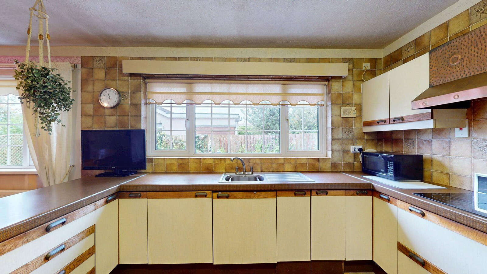 21'2 x 11'10 Good range of units with matching worktops and breakfast bar. Stainless steel sink unit and single drainer with chrome mixer taps. Part tiled walls. Vinyl floor covering to kitchen area. BELLING double eyelevel oven and 4 ring induction hob with canopy housing concealed extractor fan.