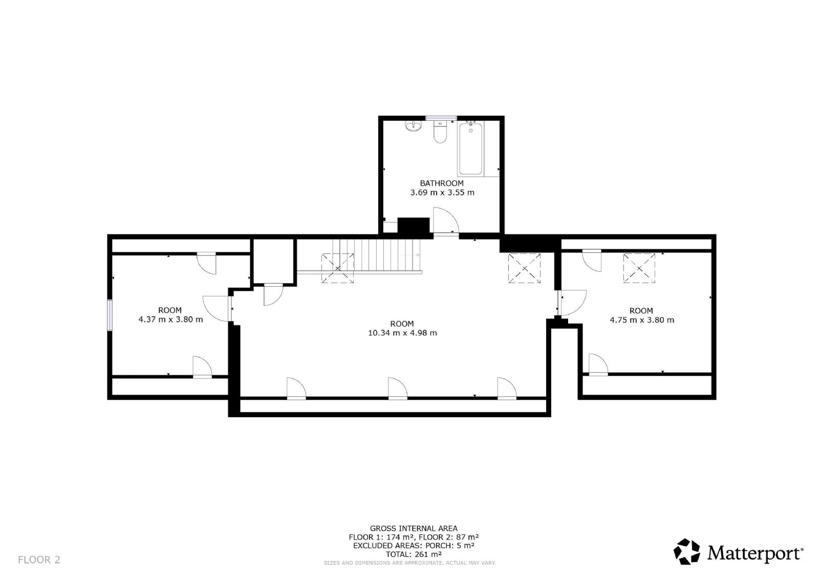 7'4 x 3'4 White two piece suite comprising pedestal wash wash basin and low flush w.c. Part tiled walls. Tiled floor.