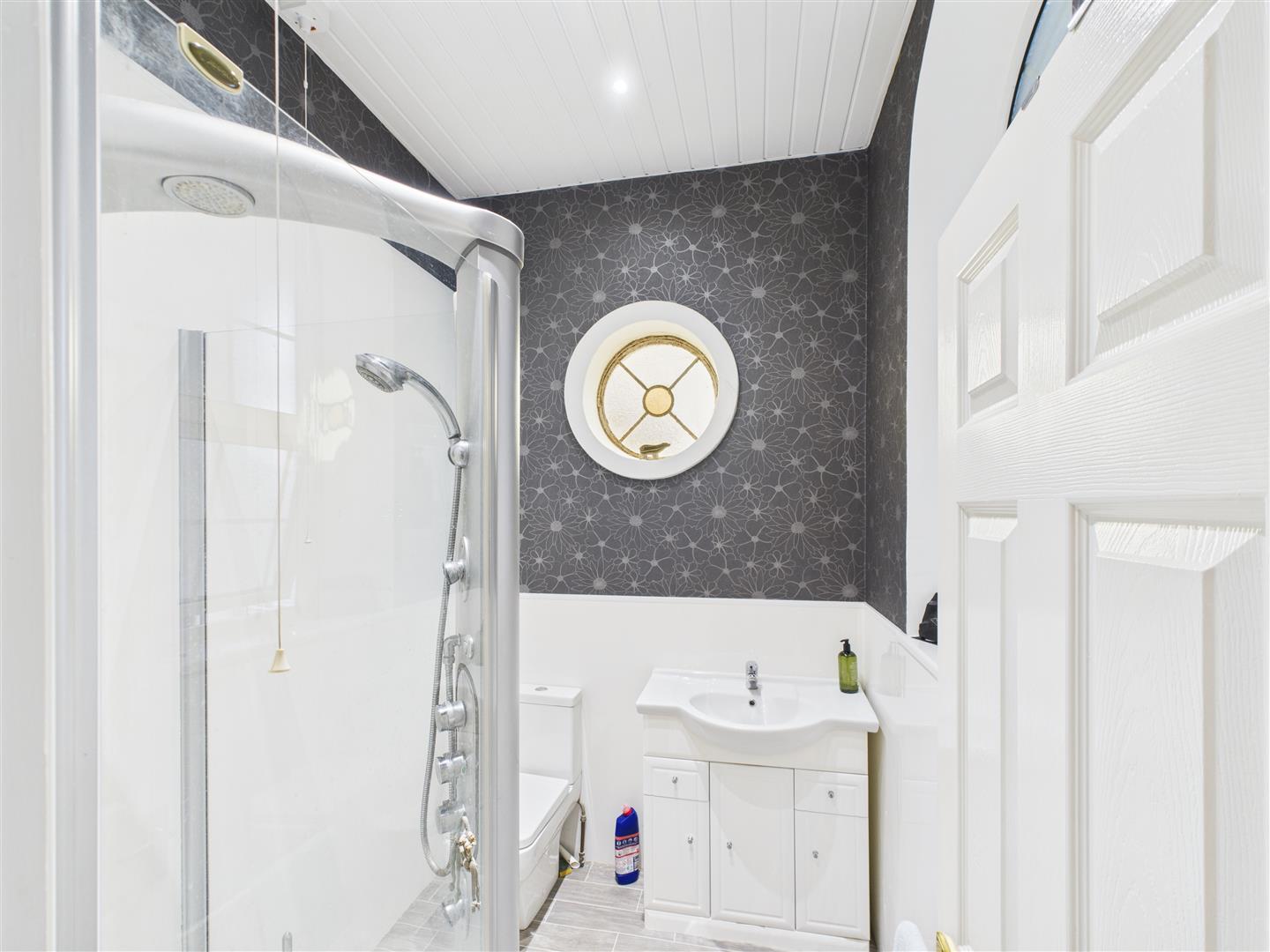Fully panelled shower cubicle with electric shower. Feature porthole window. Low Flush W.C. Wall mounted wash hand basin. Tiled flooring.