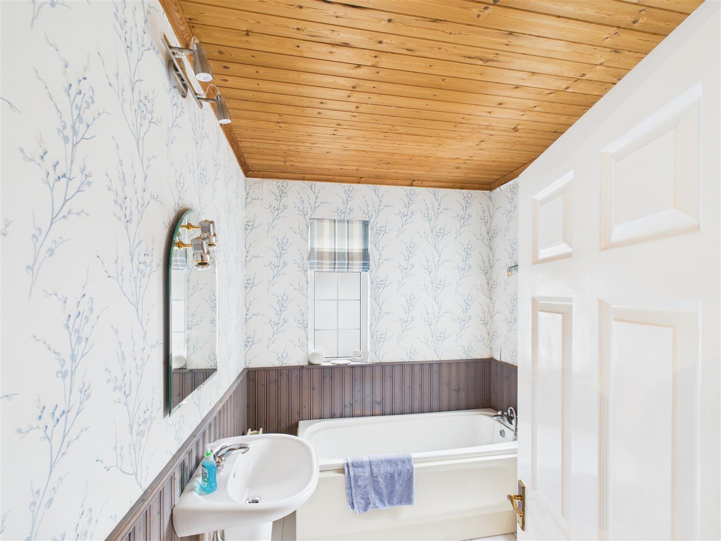 With a fitted white bath. Pedestal wash hand basin. Low Flush W.C. Pine ceiling. Wall panelling. Tiled flooring.