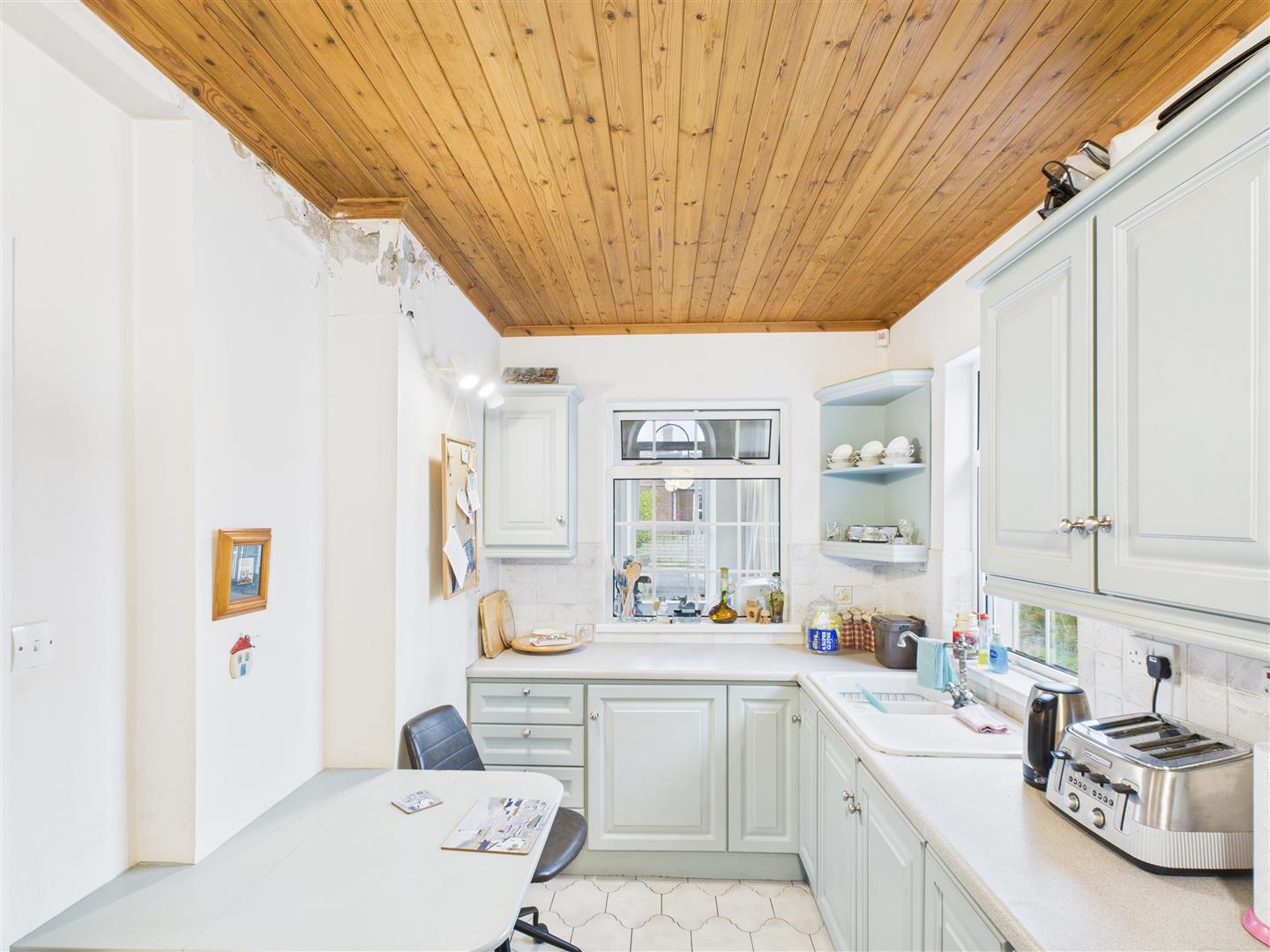 Fitted with a range of eye and low levels with matching worktop. Tiled around units. Ceramic sink unit. Point for hob and oven. Extractor fan and light. Plumbed for dishwasher. Wine display rack. Corner display unit. Tiled flooring. Pine ceiling.