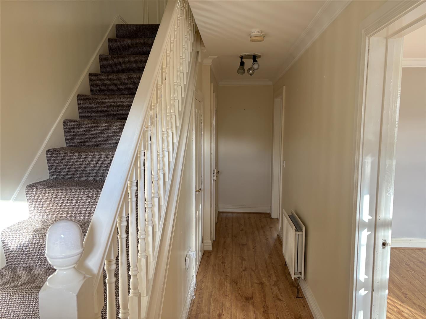 with under-stair storage, coving around ceiling, wood effect laminate flooring.
