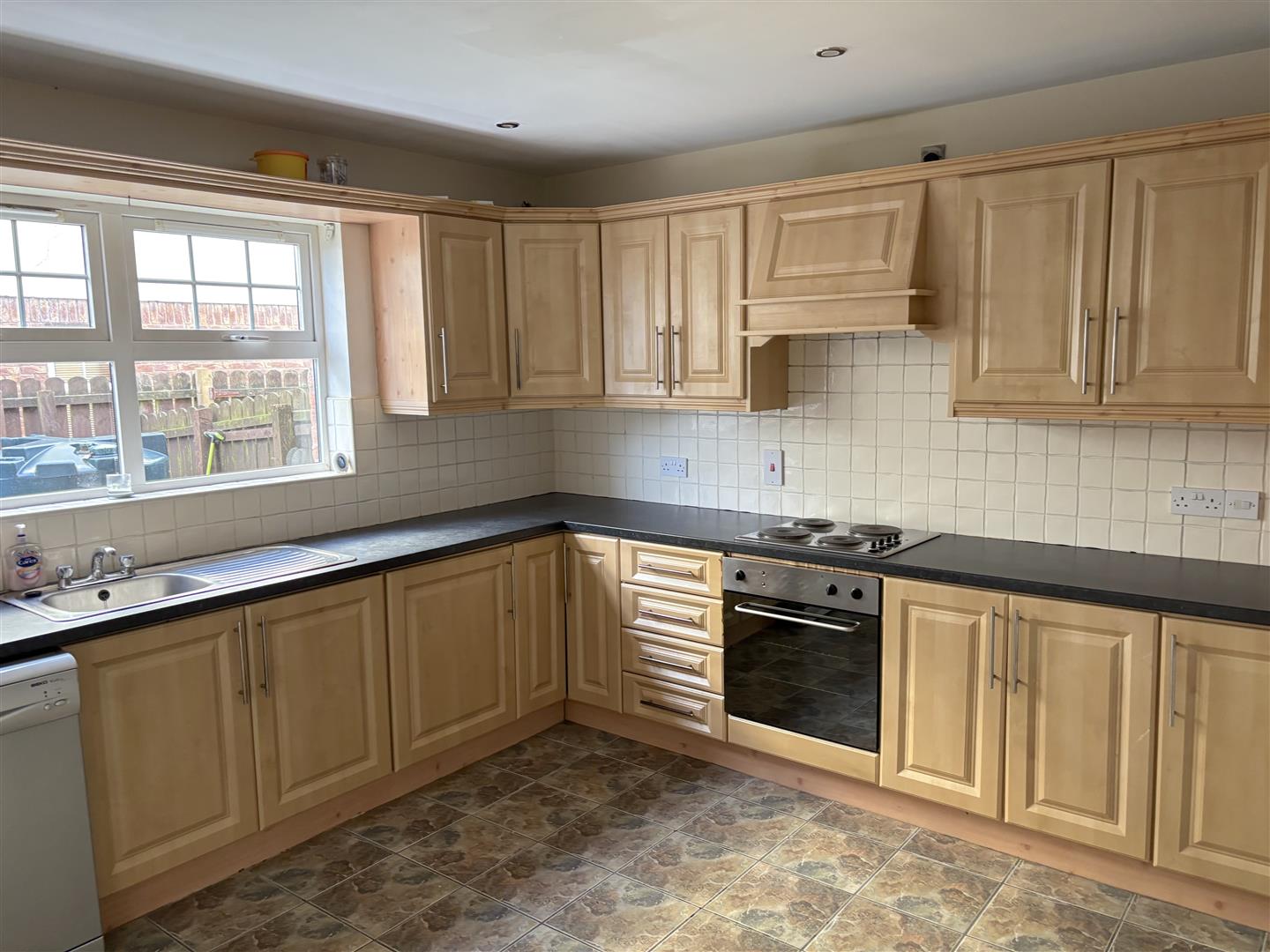 with a range of eye and low level units, matching worktop, tiled around units, stainless steel sink unit, built-in hob and oven, extractor fan with light, corner display unit, plumbed for dishwasher, recess low voltage down-lighters, tiled flooring.