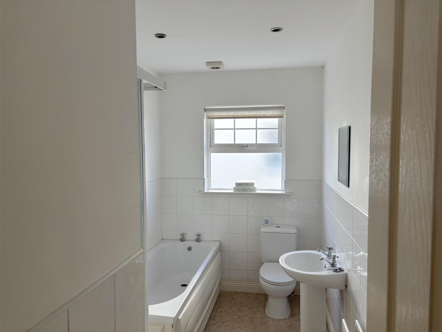 having three piece suite comprising of fitted bath, pedestal wash hand basin, low flush w.c., fully tiled shower cubicle with electric shower. Also having part tiled walls, cushion flooring.