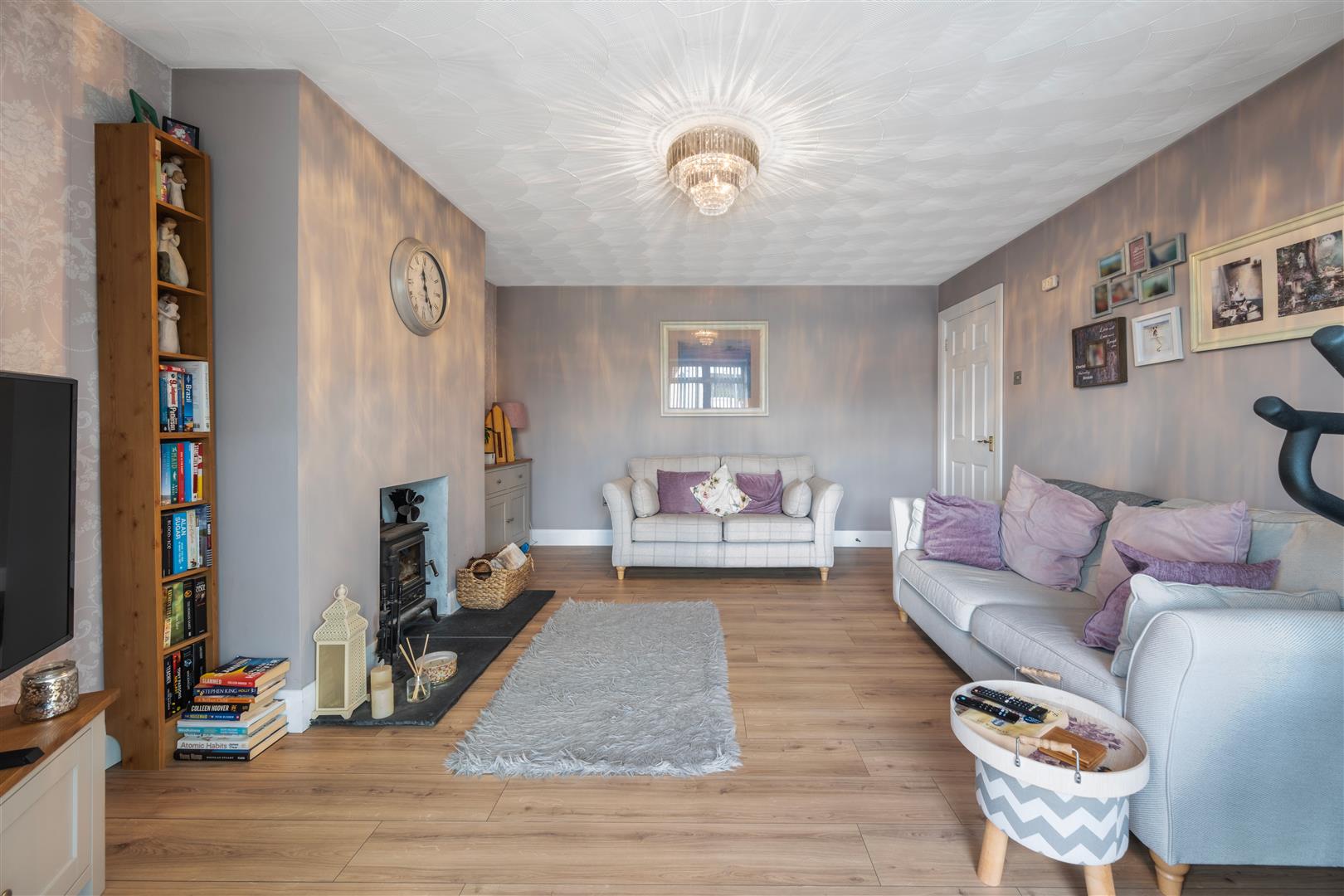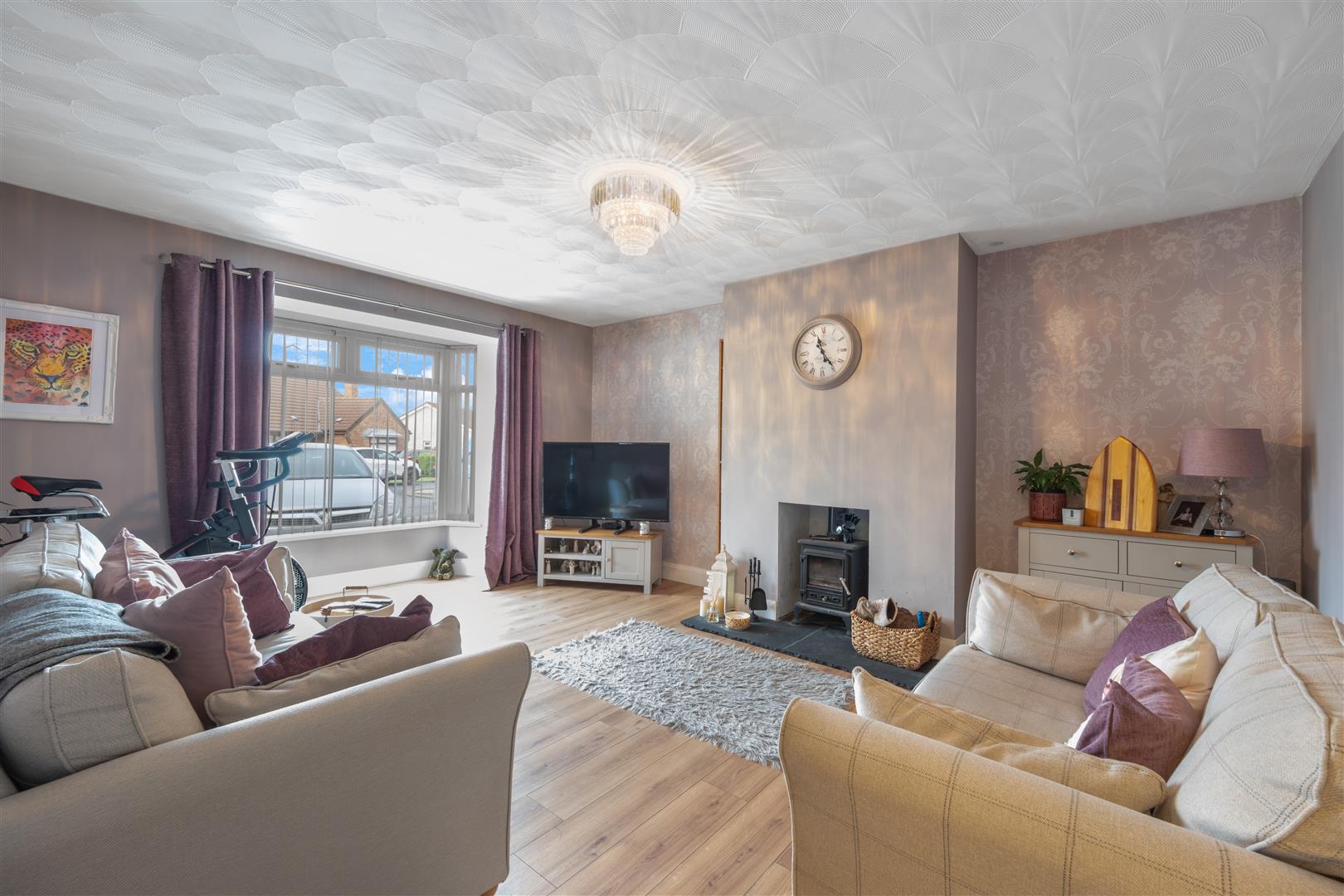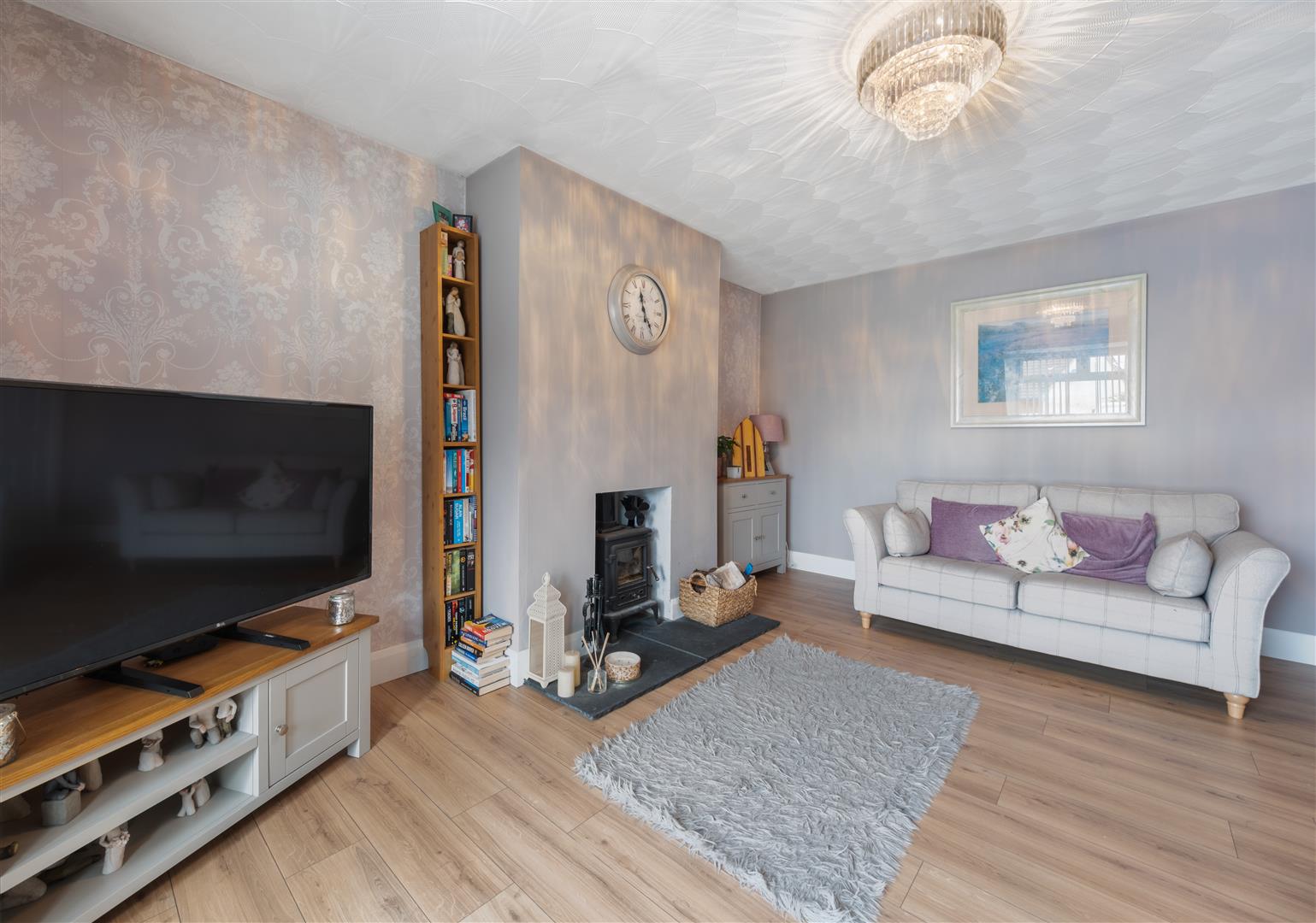 Internally, the property is presented to a high standard throughout and offers well proportioned accommodation comprising a bright entrance hall, spacious living room with feature bay window and stove, and an open plan kitchen/dining area with patio doors leading out to the rear garden, with a separate utility room and back door access.